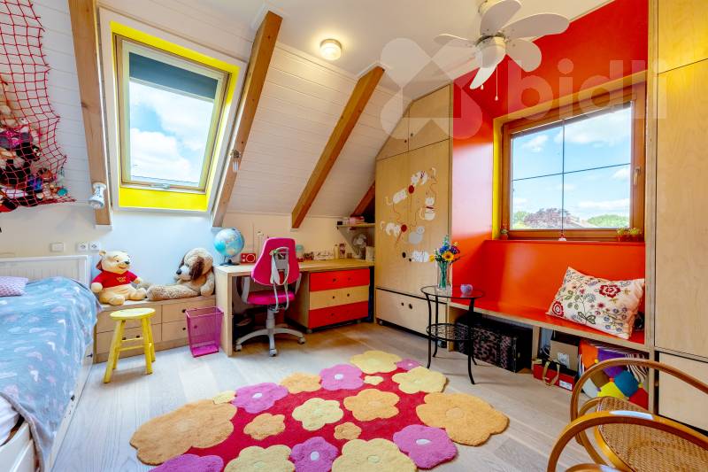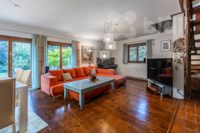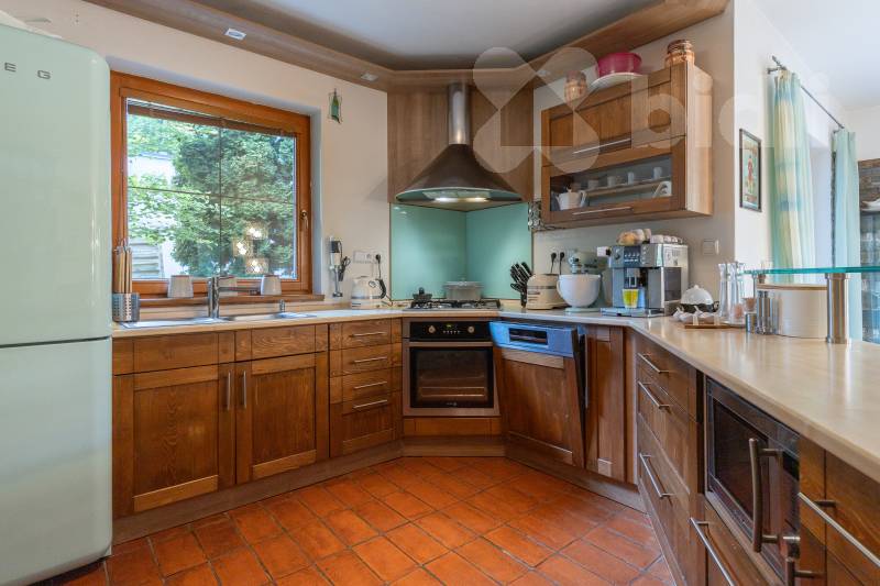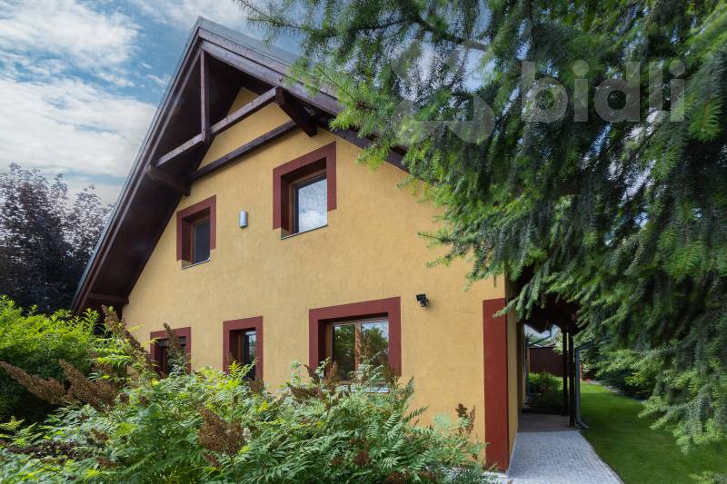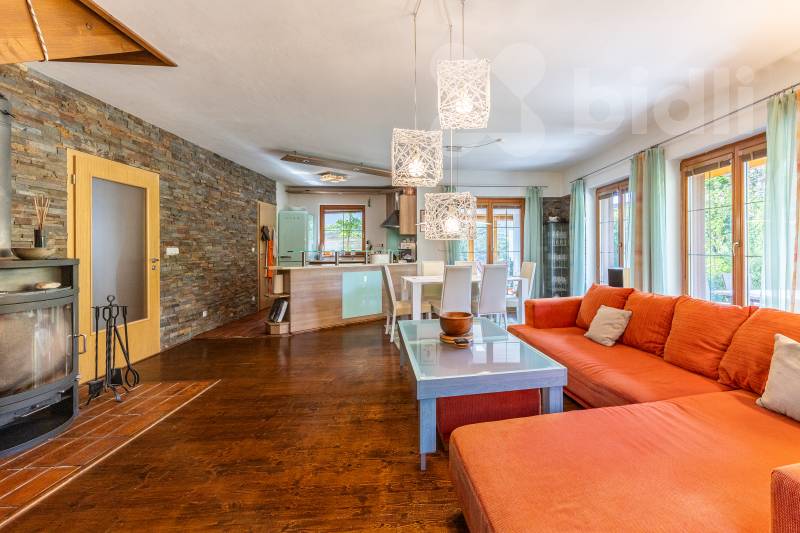 Kvalitní materiály a design: Dům je postaven z prvotřídních materiálů, disponuje dřevěnými eurookny, střešní krytina je z pálené glazurované tašky. V interiéru najdete kompletně vybavenou kuchyňskou linku a krbová kamna na dřevo o výkonu 10 kW.