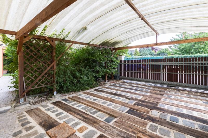 Úložné prostory a parkování: K dispozici je zahradní domek, kůlna (19m2) s alarmem a zastřešené stání pro 2 automobily ochraňující vůči krupobití a námraze.