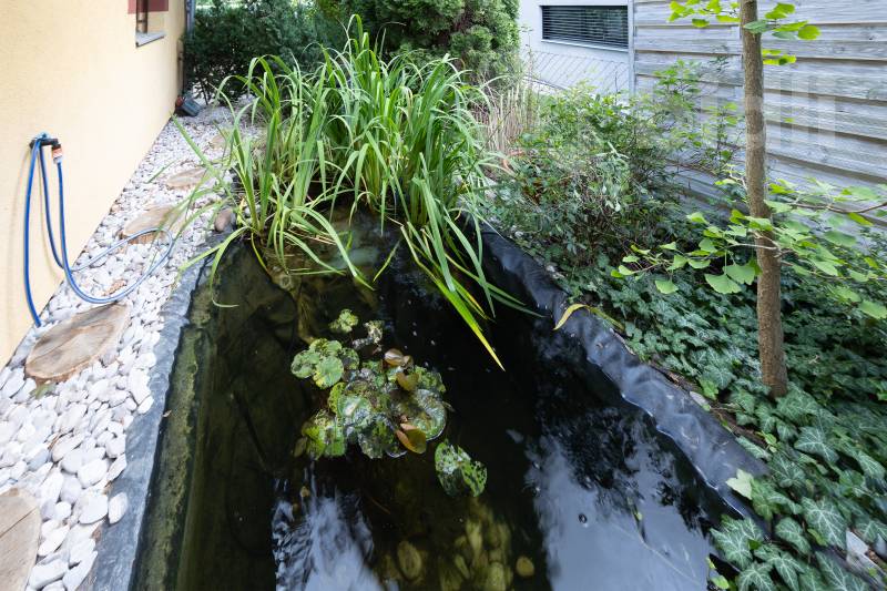Úžasné venkovní prostory: Vychutnejte si 30 m² terasu z tropického dřeva, stejně jako 9 m² zimní zahrady s podlahovým vytápěním a příjemným posezením. Na zahradě naleznete jezírko s lekníny a vzrostlé stromy i okrasné keře, které poskytují stín.