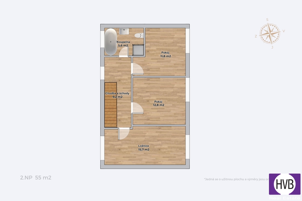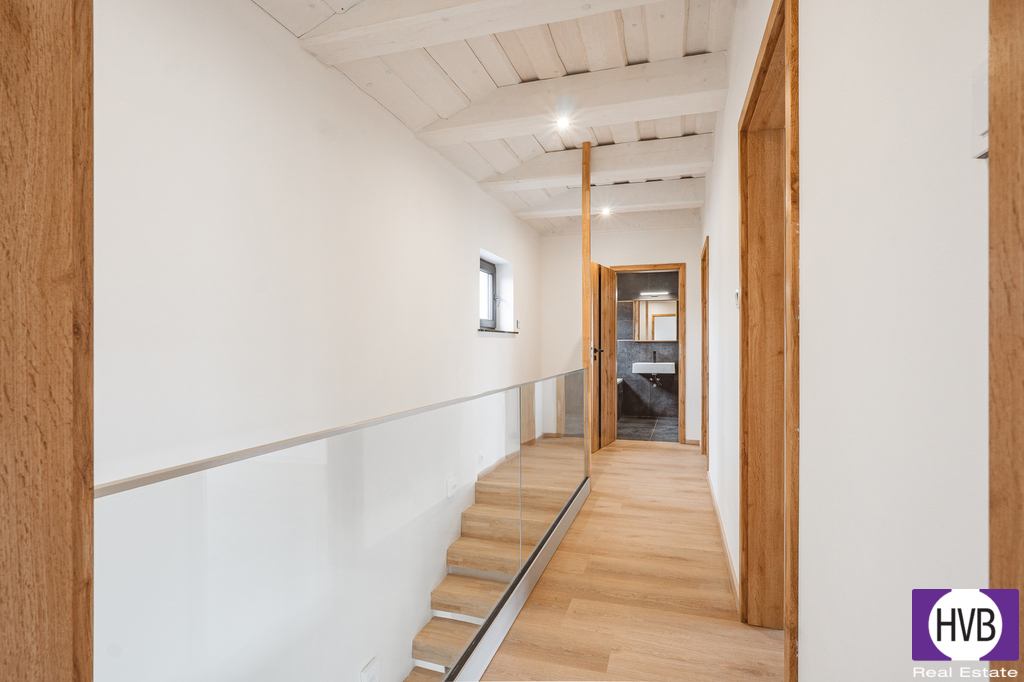 Horní patro nabízí tři samostatné pokoje. Jeden z nich slouží jako hlavní ložnice, další dva mohou být využity jako dětské pokoje, pracovna nebo pokoj pro hosty. V patře je rovněž druhá koupelna vybavená vanou, sprchovým koutem a WC.