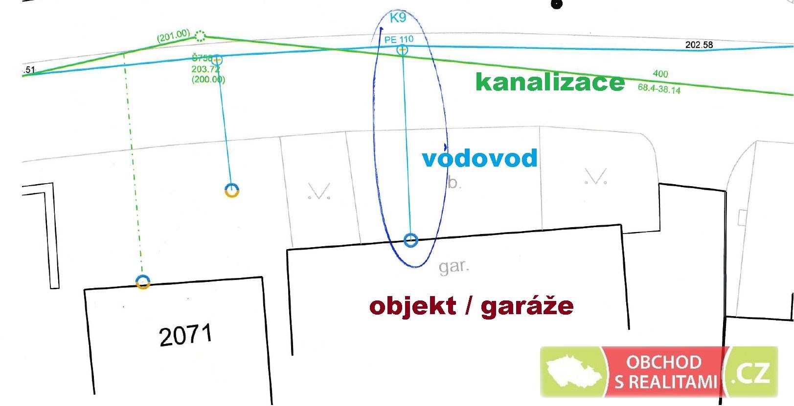 Nemovitost je napojena na vodovod a veřejný rozvod elektro. Kanalizace leží v přilehlé komunikaci, zákres vedení inženýrských sítí jsme umístili do fotodokumentace této inzerce.