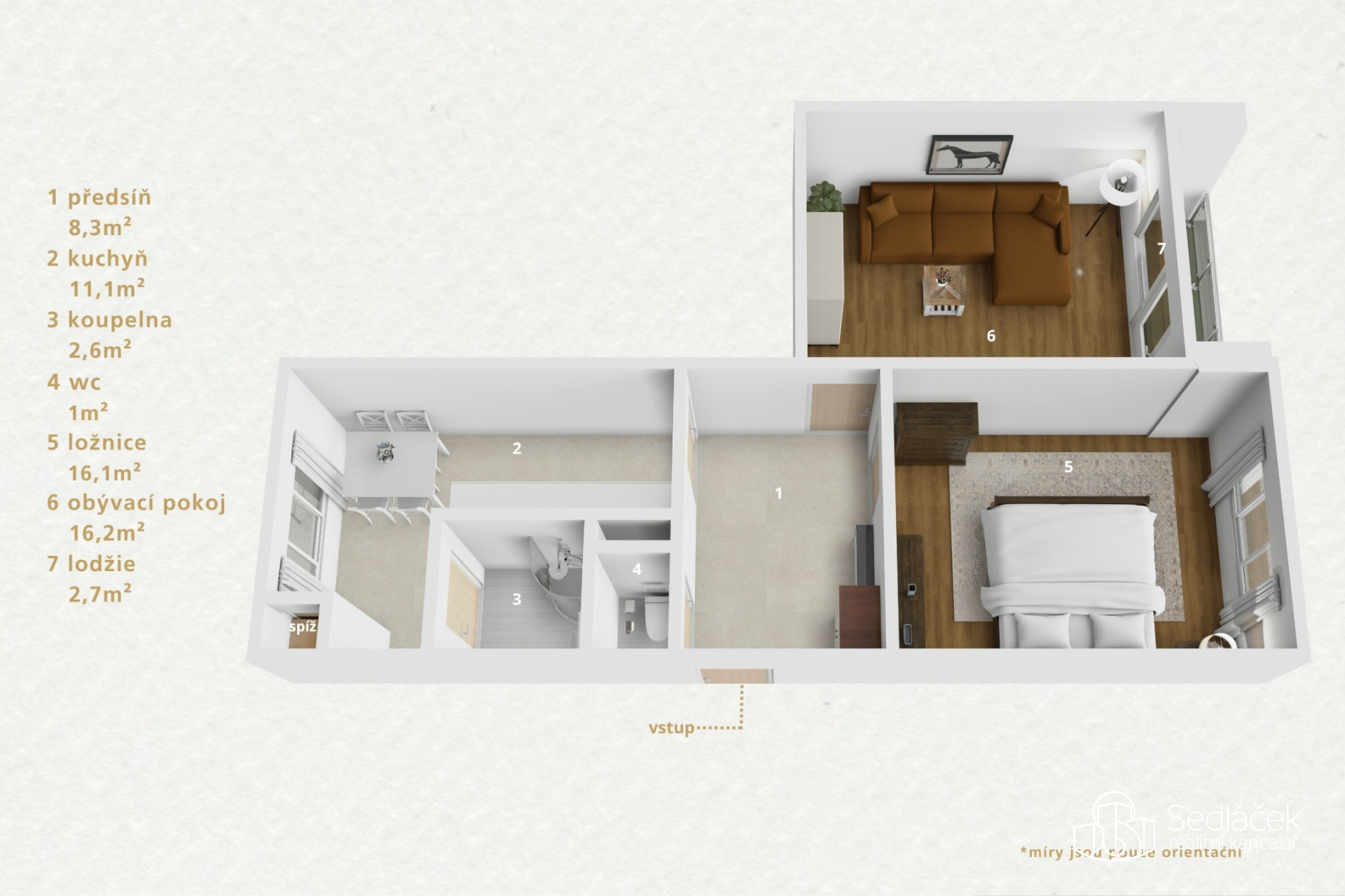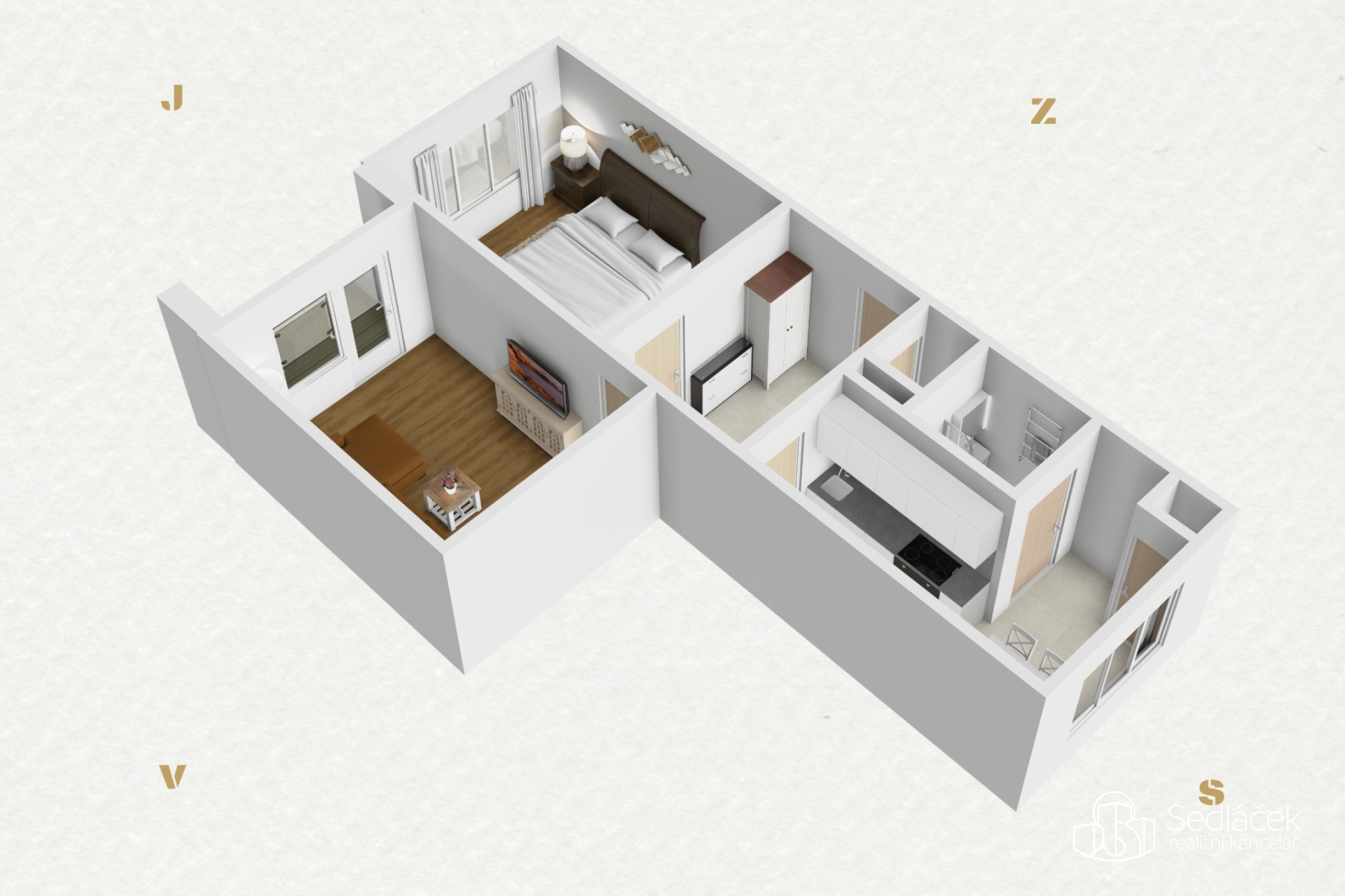 Dispozice bytu je praktická a velmi dobře řešená. Kuchyně je samostatná s dostatkem prostoru pro kuchyňskou linku i jídelní stůl. Obývací pokoj se vstupem na lodžii, samostatná ložnice. Vstupní chodba nabízí dostatek místa pro vestavěné skříně. Koupelna je vybavena sprchovým koutem, toaleta je samostatná. K bytu náleží také sklepní kóje.