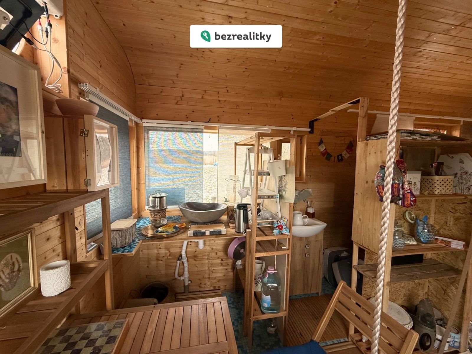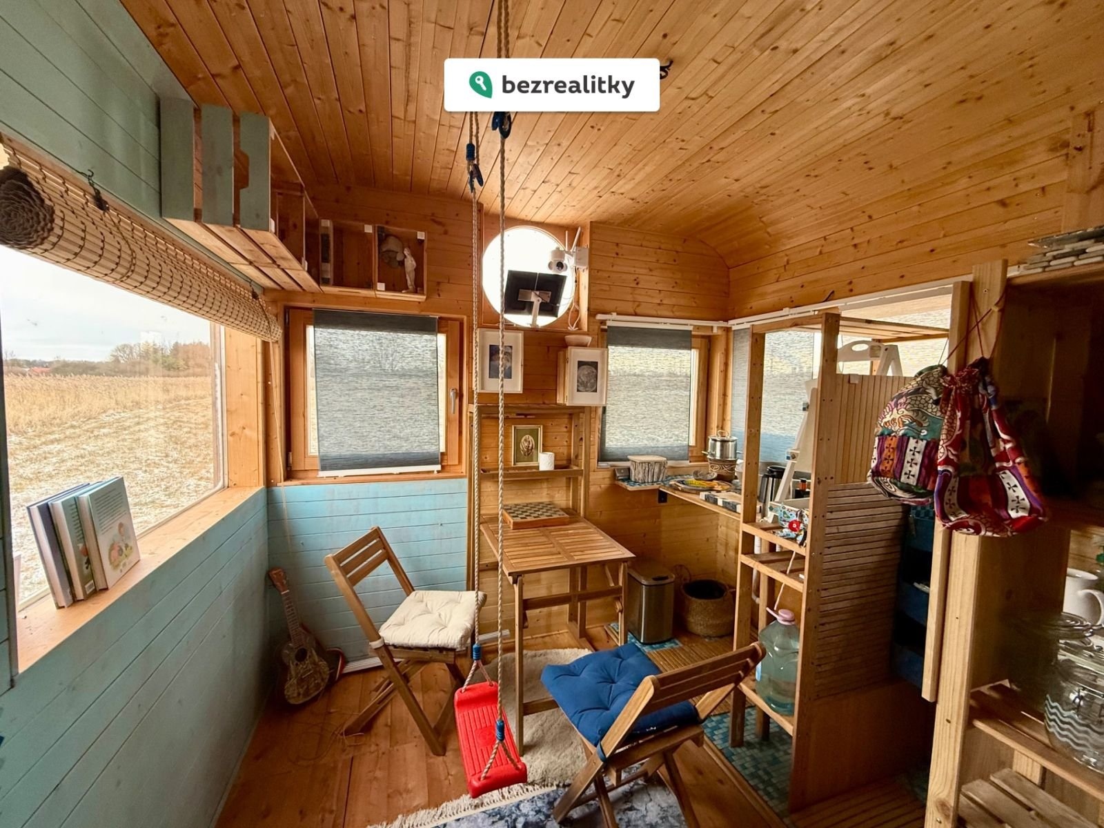 • tři velká okna zajišťující vynikající světlo a výhled do krajiny včetně ještě většího pocitu prostoru. Dále jsou v objektu 4 dřevěná okna se 2 variantami otevření) + 2 kruhová okna dodávající domečku unikátní vzhled a malé okénko v koupelně.