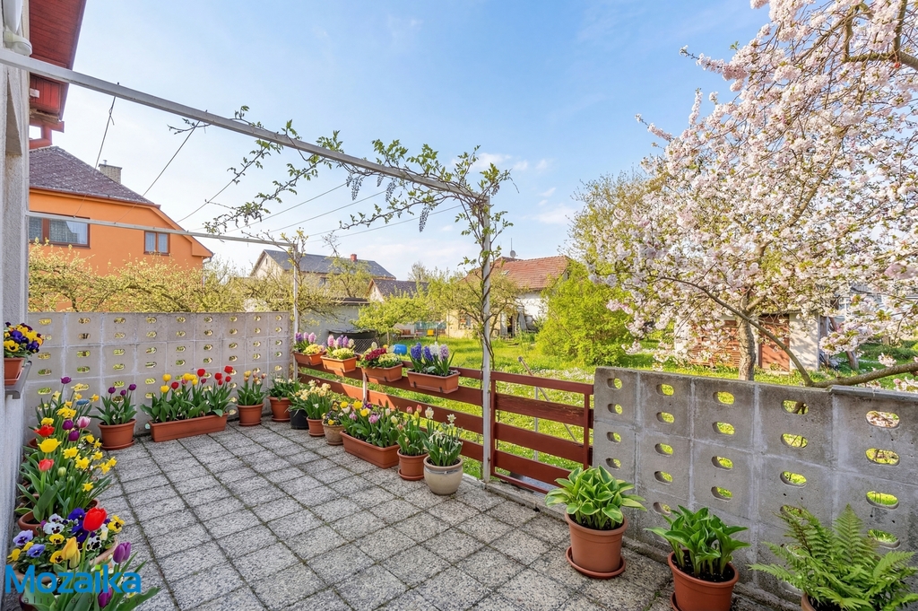 K domu náleží rovinatá oplocená zahrada se zděným zahradním domkem – ideální místo pro letní posezení, grilování či dětské hry.