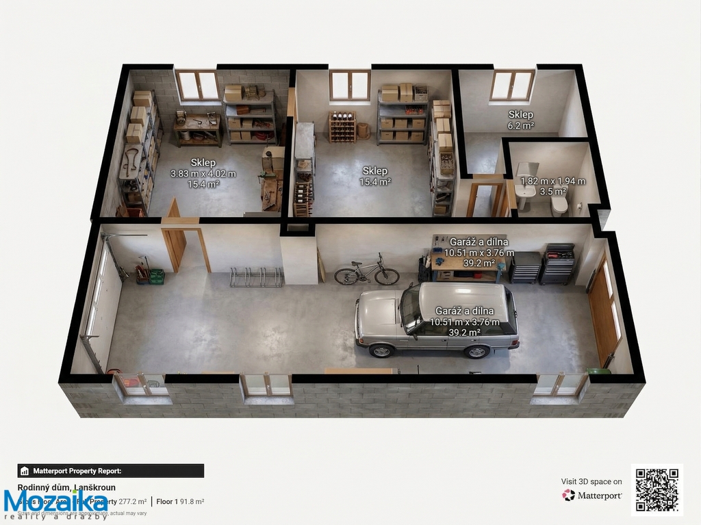 Suterén nabízí garáž s dílnou, prádelnu a tři další místnosti využitelné podle vašich potřeb – ať už jako sklady, hobby místnosti či domácí posilovnu.