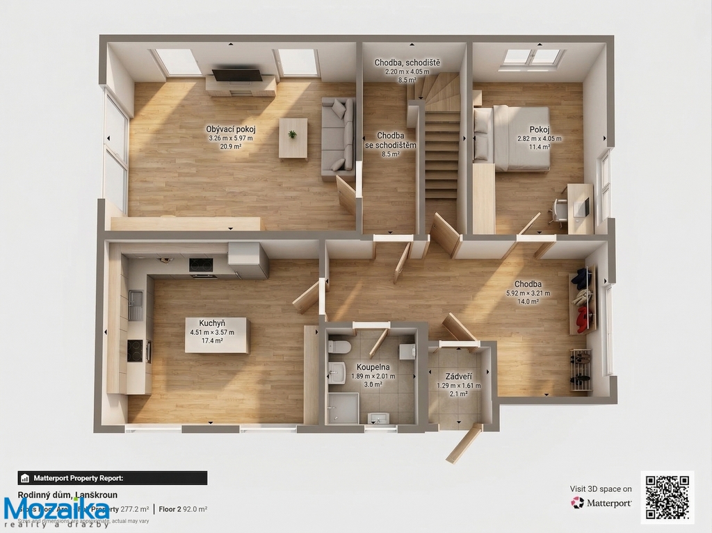 Podkroví disponuje samostatným WC, koupelnou s vanou a umyvadlem, třemi pokoji, druhou kuchyní, komorou a půdním prostorem. Tato dispozice je ideální pro rodiny s dětmi i pro vícegenerační bydlení.