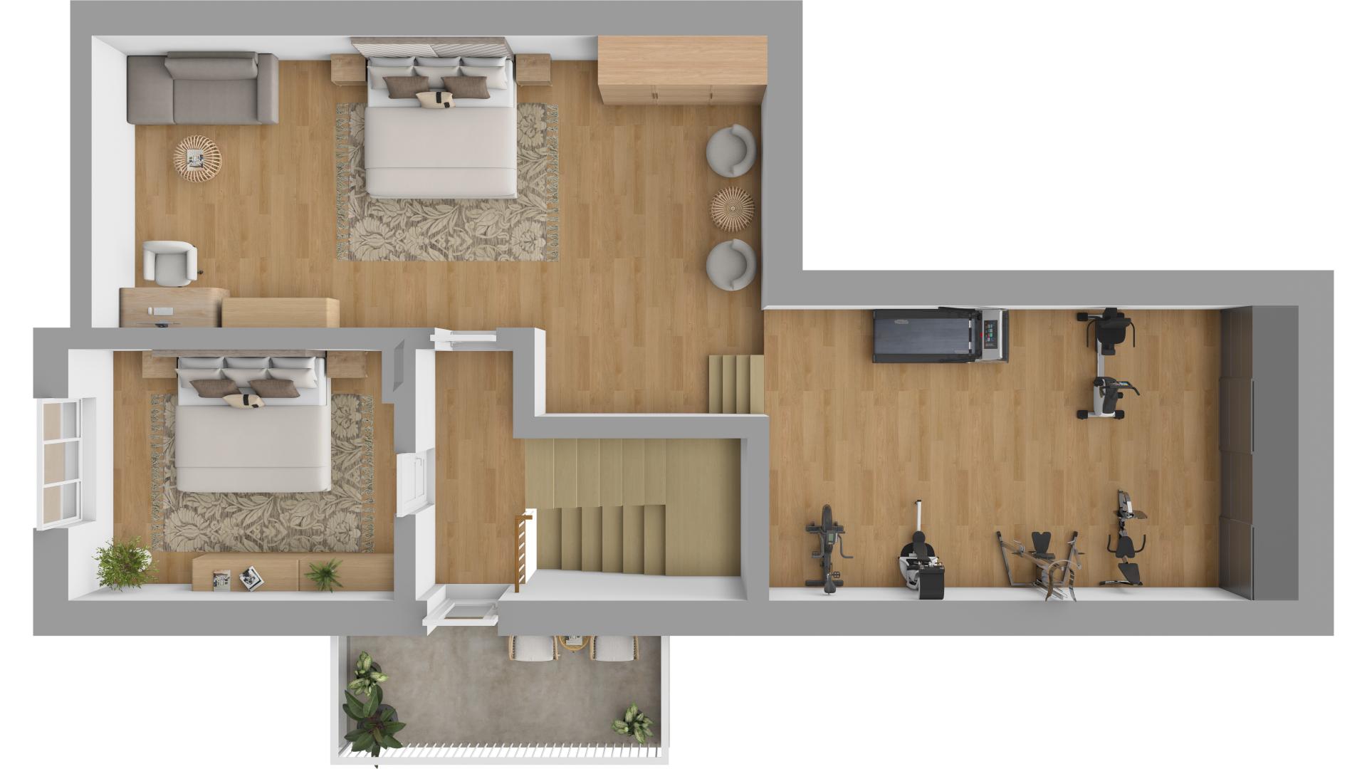 1. NP: 3 pokoje + kuchyňský kout, koupelna s WC
