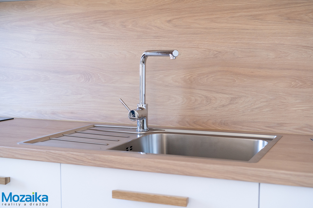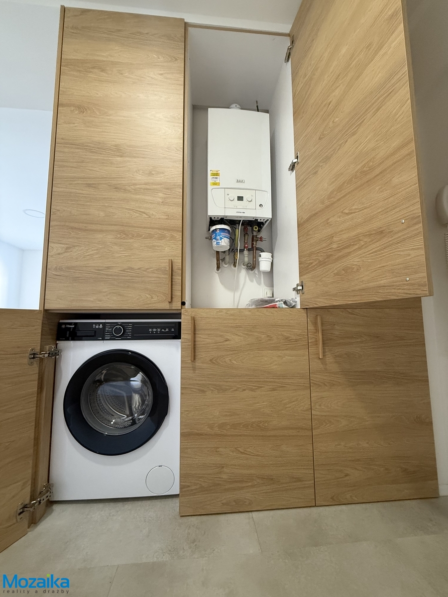 - Vybavení: moderní kuchyňská linka s vestavnými spotřebiči, vestavné skříně, sprchový kout, pračka
