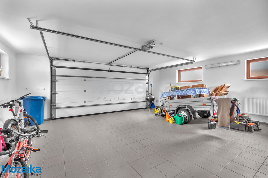 Okna jsou dřevěná typu EURO s izolačním dvojsklem a celoobvodovým kováním, což přispívá k výborné tepelné a zvukové izolaci a zajišťuje maximální komfort bydlení. Vnitřní dveře jsou také dřevěné, osazené do obložkových zárubní, což dodává domu elegantní a nadčasový vzhled. Garážová vrata jsou sekční, zateplená a vyrobená z kovové konstrukce s možností dálkového ovládání.