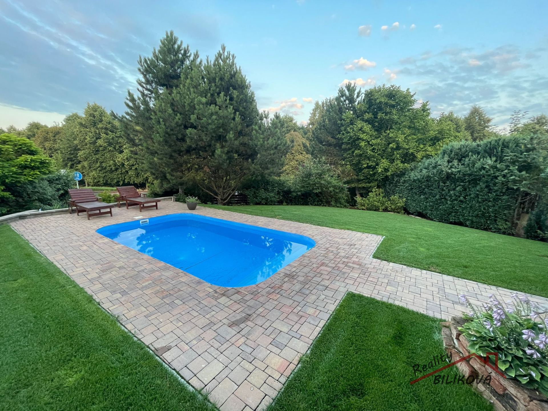 Na zahradě zapuštěný bazén 3x6m, vzrostlá zeleň, studna na kterou je zapojena závlaha.