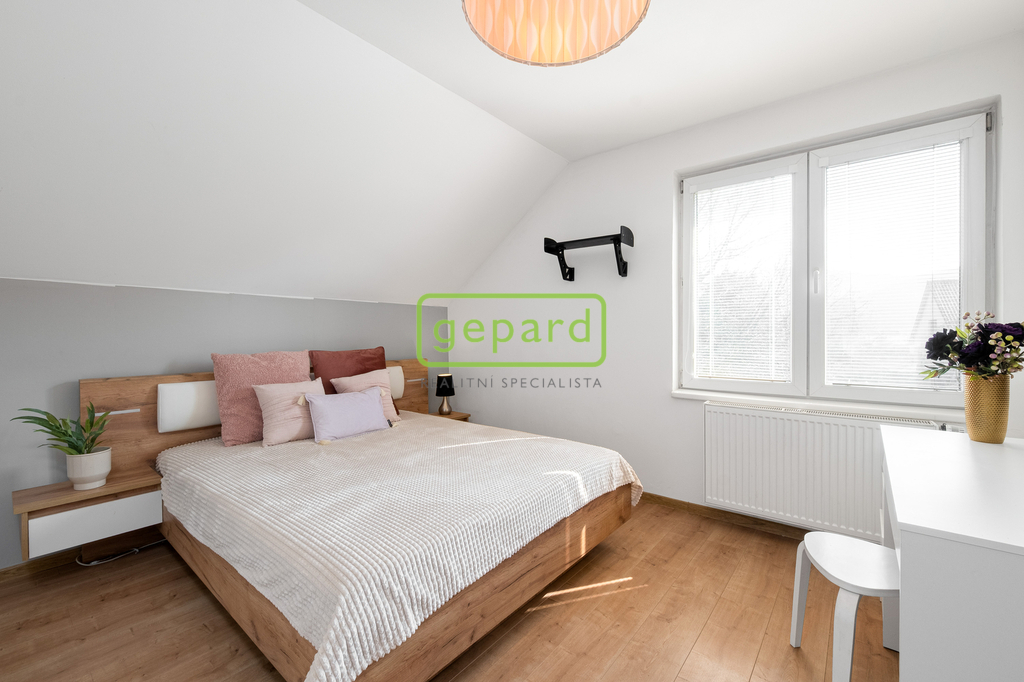 Už při vstupu vás překvapí příjemná vzdušnost a množství světla. Hlavní obytné podlaží působí otevřeně a přirozeně propojuje obývací prostor s kuchyní, odkud se vychází na balkon. Je to místo pro každodenní život a setkávání. Nechybí ložnice s vestavěnou skříní a koupelna s vanou. Horní patro nabízí další úroveň soukromí – samostatné pokoje, pracovnu i oddělenou koupelnu a toaletu. Velkým benefitem je terasa s otevřeným výhledem do okolní krajiny, která má své kouzlo v každém ročním období. Jeden z pokojů je navíc rozšířen o praktické spací patro, které přidává další využitelné metry – ať už pro spaní, relax nebo kreativní prostor.