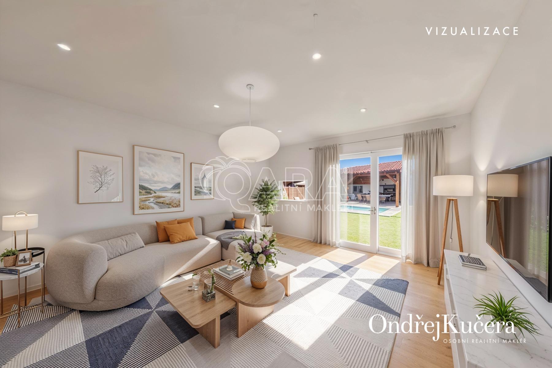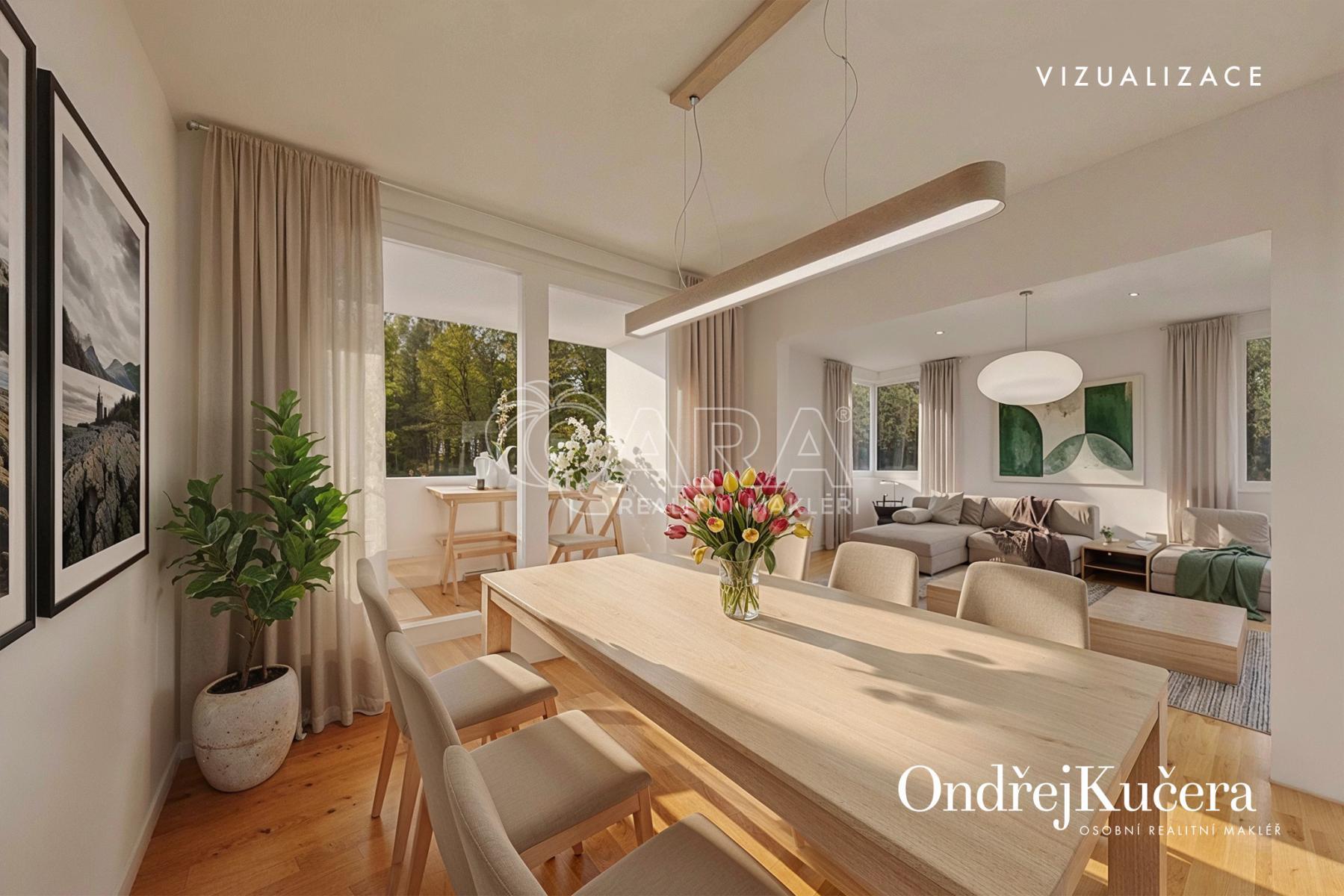 Dispozice domu je řešena prakticky a s důrazem na každodenní fungování. V přízemí se nachází vstupní hala, technické zázemí, prádelna, skladové prostory a garáž. V patře je obytná část o dispozici 3+1, tedy dva samostatné pokoje, obývací pokoj, jídelna a kuchyně. Z haly je přímý vstup na prostornou terasu o velikosti přibližně 25 m and sup2;, která přirozeně propojuje interiér se zahradou. Vše je navrženo pro flexibilní využití. Obytná část se nachází v patře, zatímco přízemí lze přebudovat na plnohodnotnou druhou bytovou jednotku. To otevírá možnosti vícegeneračního bydlení, odděleného prostoru pro hosty nebo kombinace bydlení a investice.