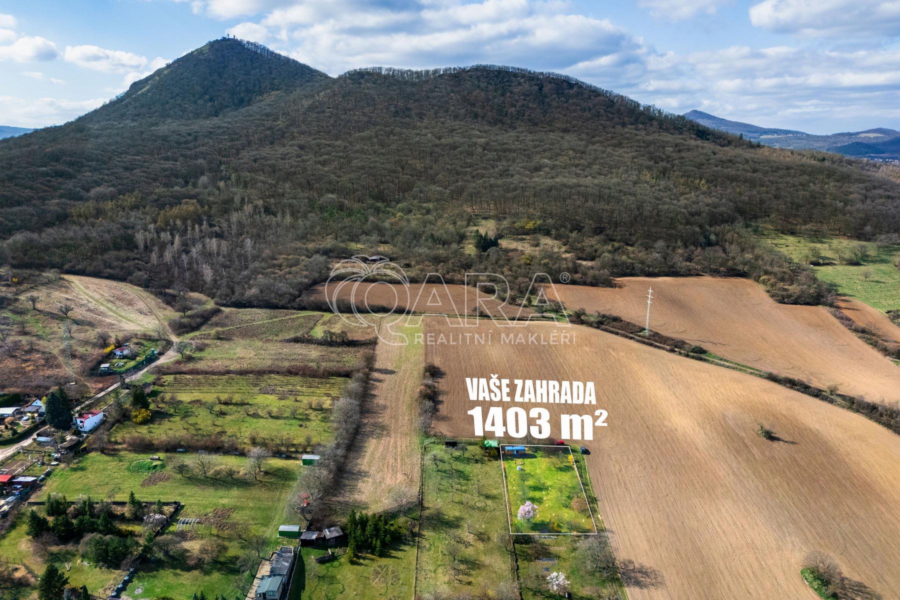 Za pozemkem se zvedá chráněné území s ikonickým vrchem Lovoš, pod kopcem tiše plyne Labe a z druhé strany se otevírá pohled na Radobýl.