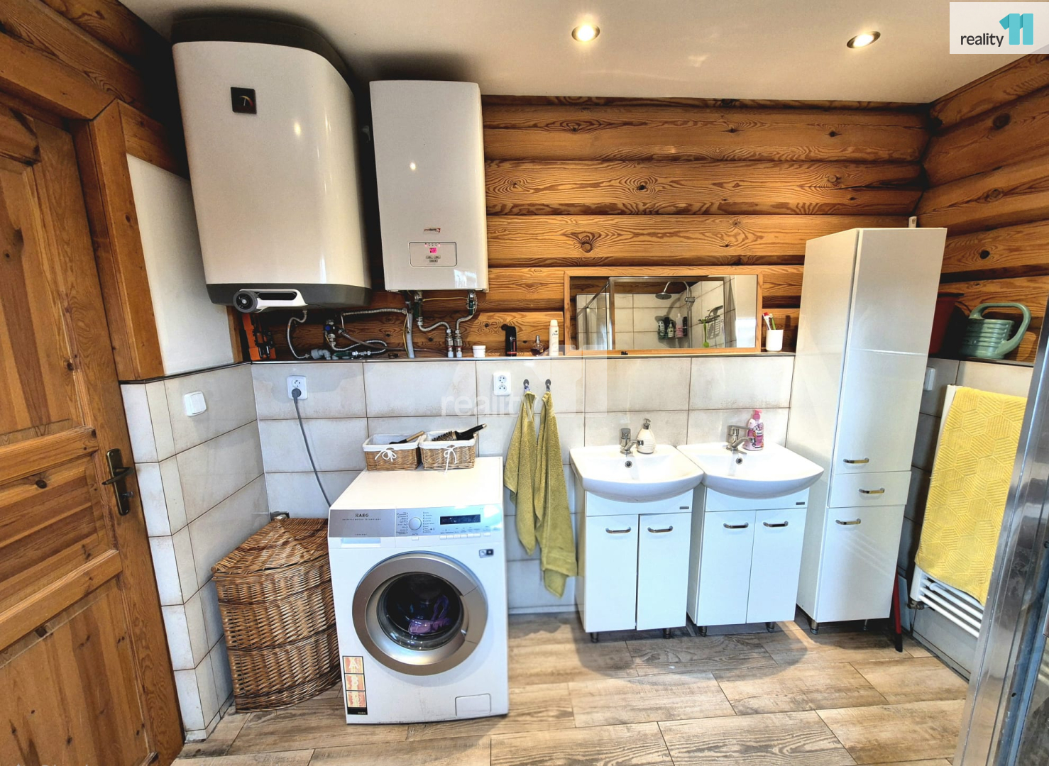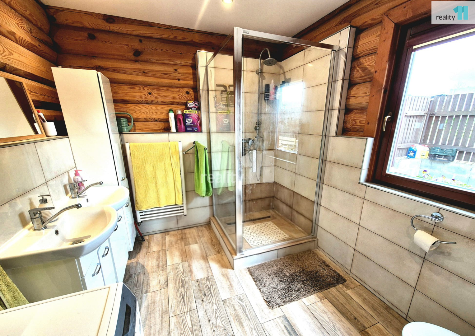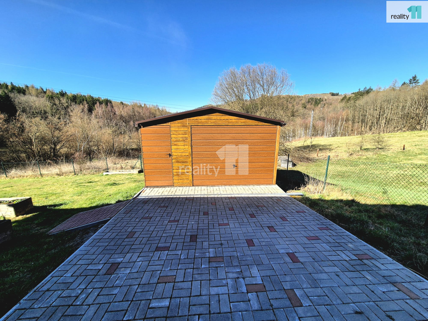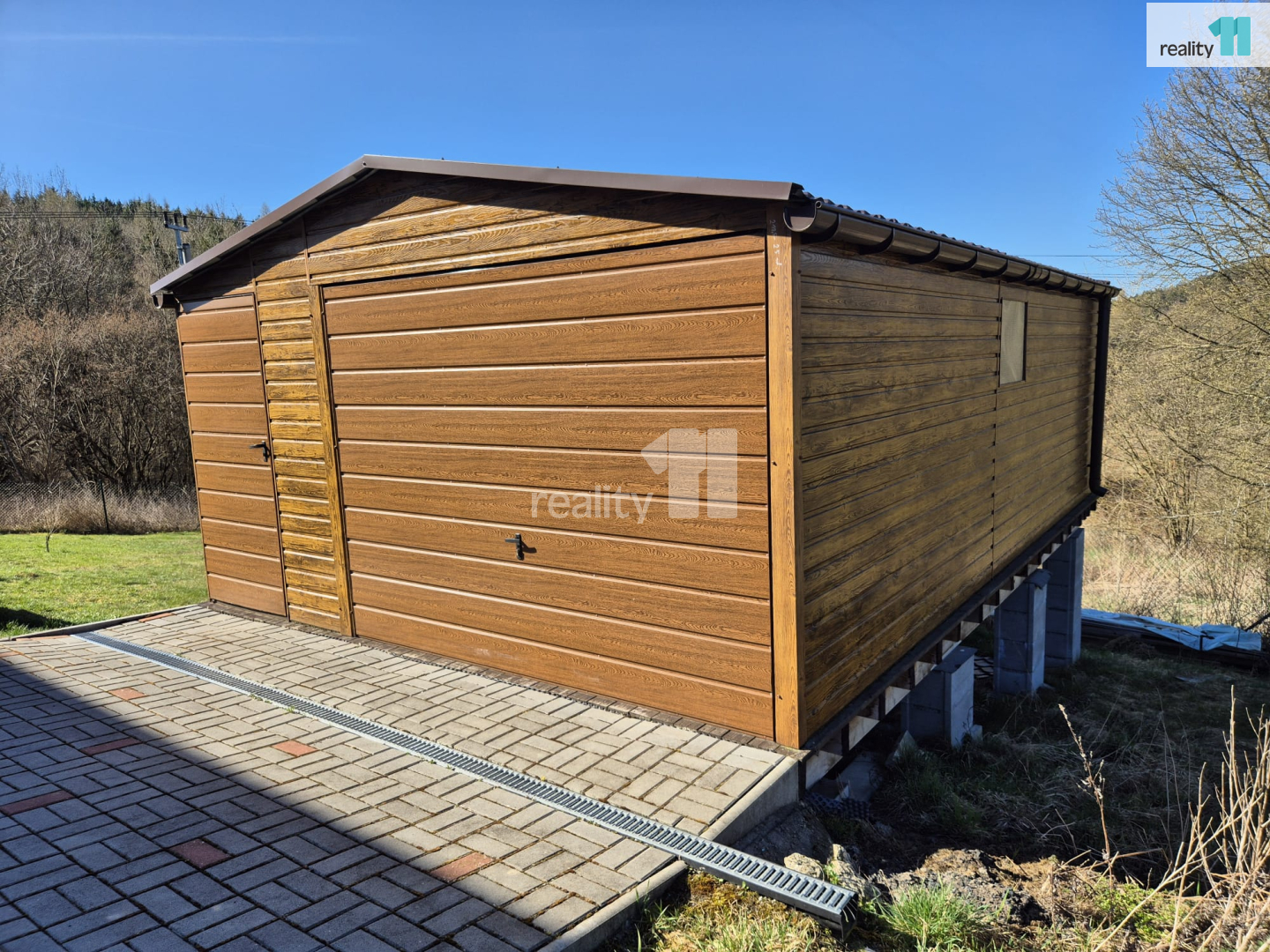 Součástí nemovitosti je také garáž v dekoru dřeva výměře cca 26 m², která přirozeně ladí se srubem.