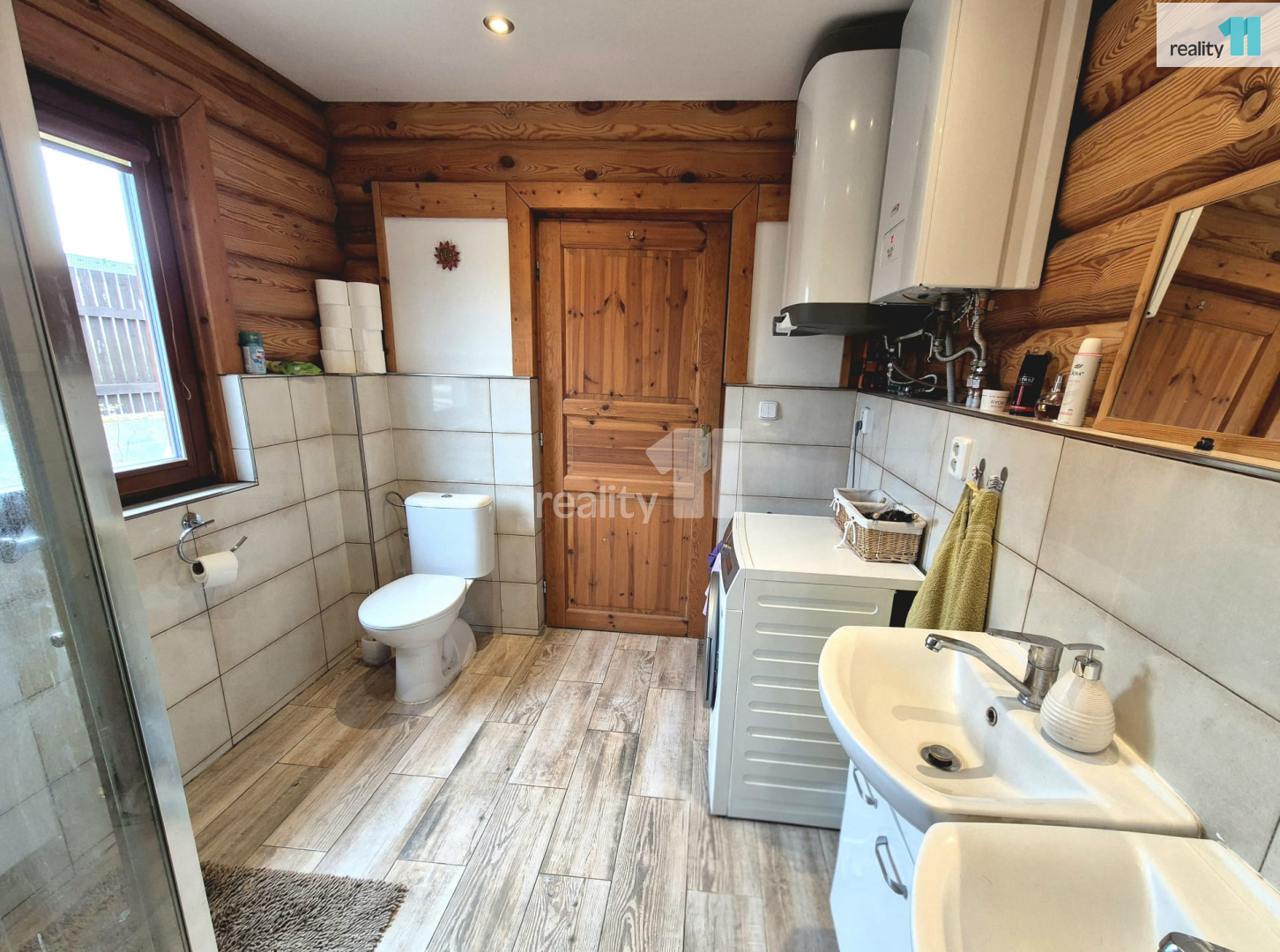 Součástí nemovitosti je také garáž v dekoru dřeva výměře cca 26 m², která přirozeně ladí se srubem.