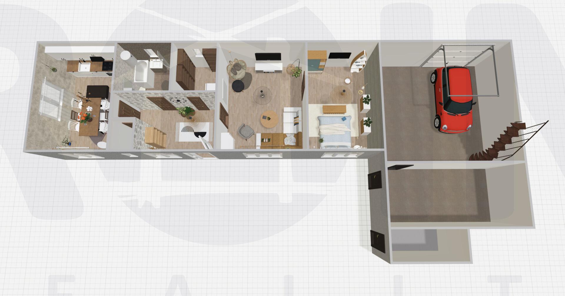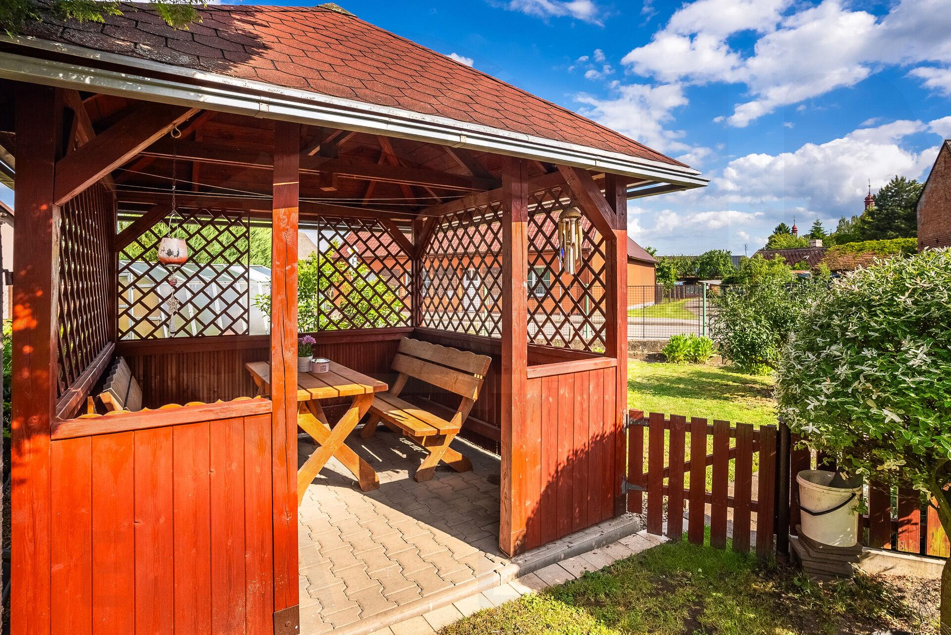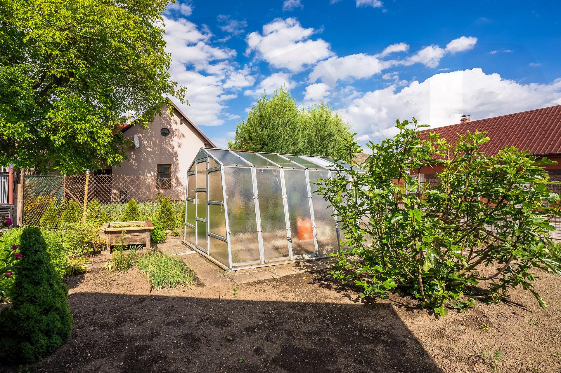 Další výhodou tohoto bydlení jsou venkovní prostory- velmi prakticky řešeny. K domu náleží jen menší zahrádka o ploše 253 m2, ale členitost a rozmístění jednotlivých částí Vám nabízí nejen relaxační část se zastřešenou pergolou a travnatou plochou, ale i místo pro chov drobných domácích zvířat jako slepic nebo králíků, a pokud jste vášniví zahradníci, nebojte, skleník i záhonky tu naleznete rovněž.