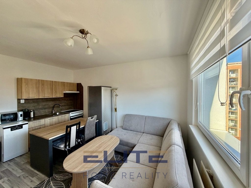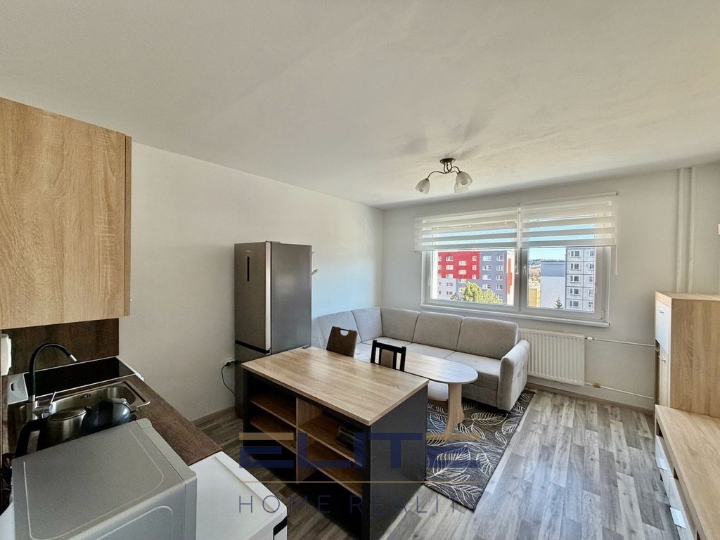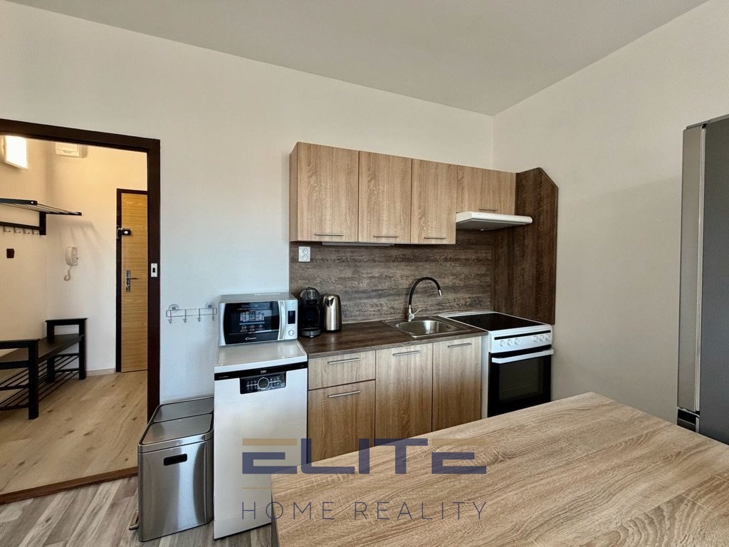 Kuchyňská linka je plně vybavena spotřebiči a byt je pronajímán kompletně zařízený, takže poskytuje komfortní bydlení bez nutnosti dalších investic.