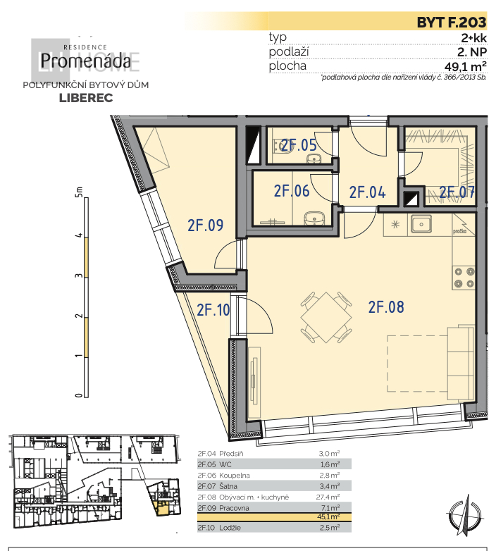 Nabízíme prodej bytu 2+kk o výměře 53,46 m2 vč. příček + balkón 4,4 m2 v projektu Residence Promenáda.