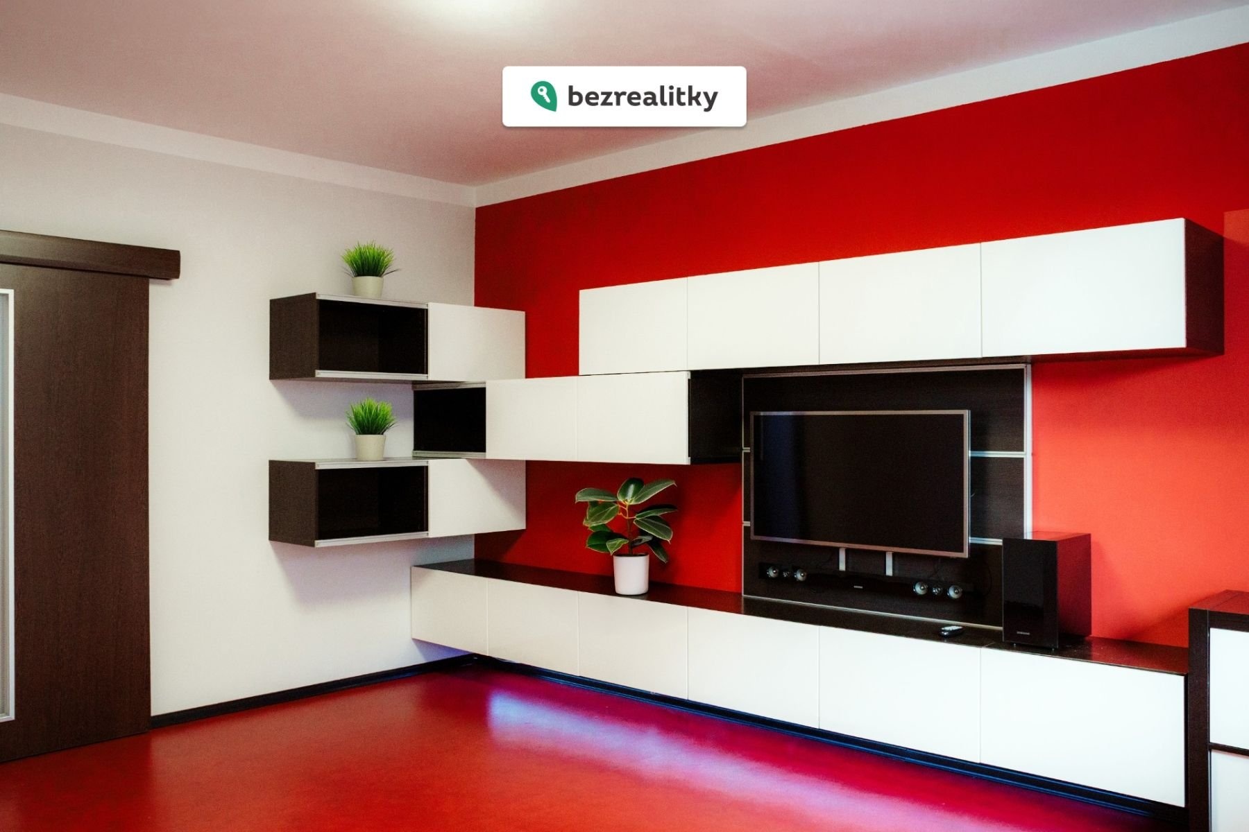 V obývacím pokoji se nachází moderní obývací stěna vyrobená na míru, součástí je TV a zabudovaný Blu-ray přehrávač.