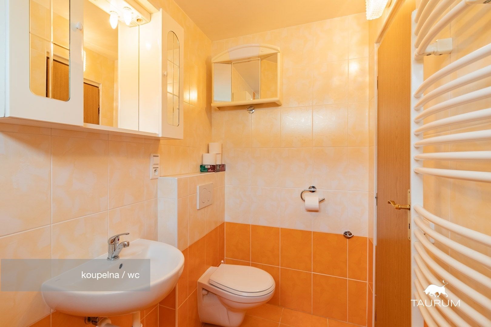 Zde se po levé straně nachází prostorná koupelna s vanou, dvěma umyvadly a bidetem, dále pak ložnice a další dva pokoje. Po pravé straně je pak spojovací místnost mezi obývacím pokojem a kuchyní, s jídelním koutem a s dalším vstupem do chodbičky, kde je k dispozici úklidová komora, samostatné WC a pak vstup na balkon lemující dům a další a poslední vstup do podkroví.