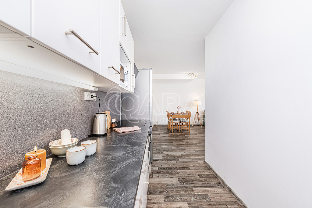 Součástí bytu je kuchyňská linka s vestavěnou troubou, indukční varnou deskou a digestoří. Byt se prodává bez nábytku.