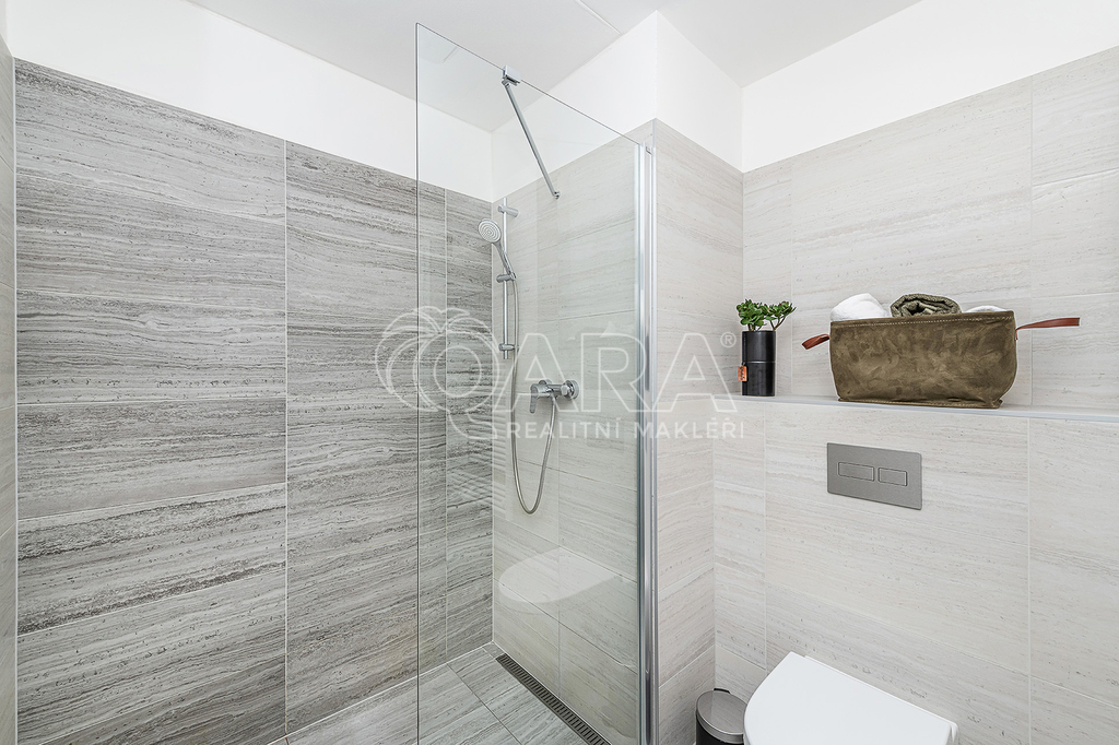 Prostorná koupelna je spojena s toaletou a nabízí walk-in sprchový kout, závěsné WC, místo pro pračku i sušičku a topný žebřík. V bytě je zavedena pozemní TV anténa, rozvody pro internet a vlastní požární senzor.