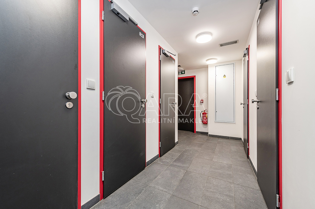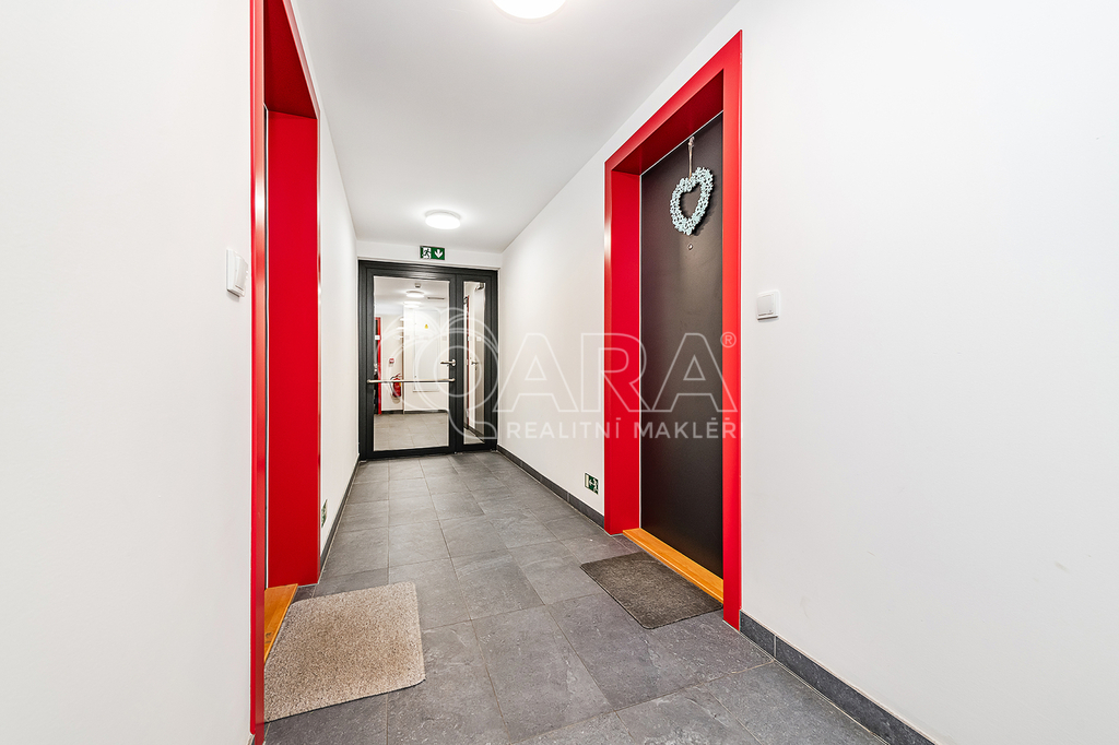 Byt se nachází ve spojovací části dvou věží rezidence, což zajišťuje snadný přístup z výtahu i z parkovacích pater.