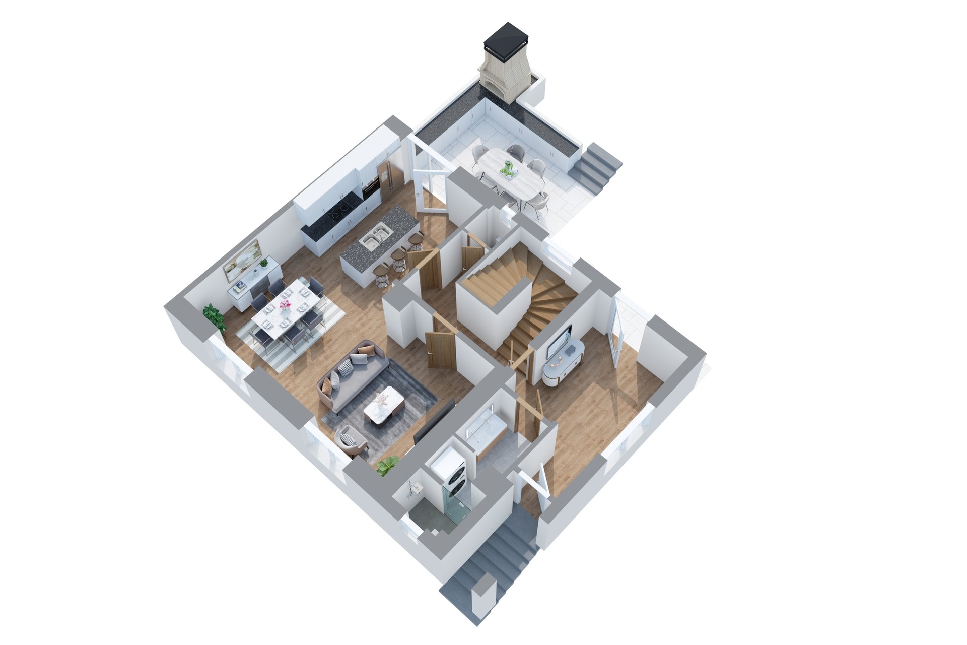 Gastronomické zážitky můžete zažít na vlastní terase. Dominantou venkovního prostoru je zastřešená terasa vybavená profesionální pecí na pizzu a samostatným grilem. K domu náleží menší zahrada se skleníkem, ideální pro pěstování vlastní zeleniny. Technologie a úspory - fotovoltaika zajišťuje výrobu vlastní elektrické energie.