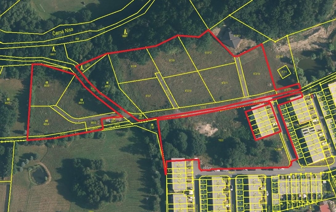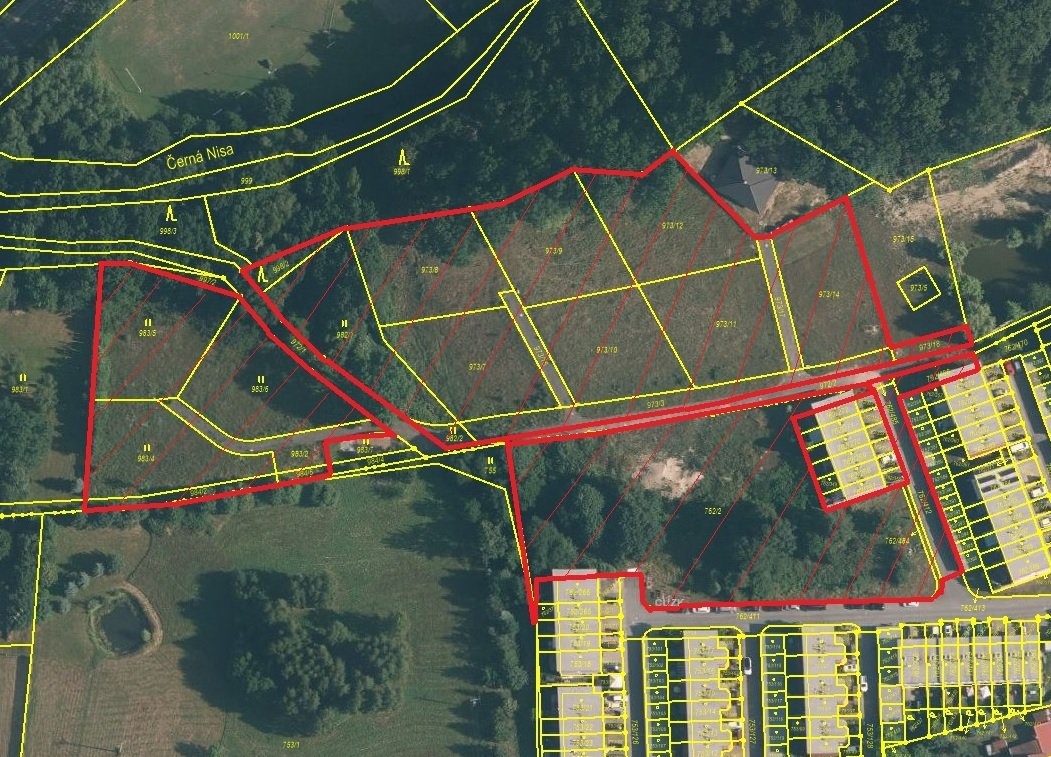 Pozemky mají celkovou výměru 13 213 m2, jsou rozparcelované na menší stavební pozemky, v blízkosti se nachází příjezdová komunikace, na části pozemku není proveden zpevněný povrch komunikace a inženýrské sítě.