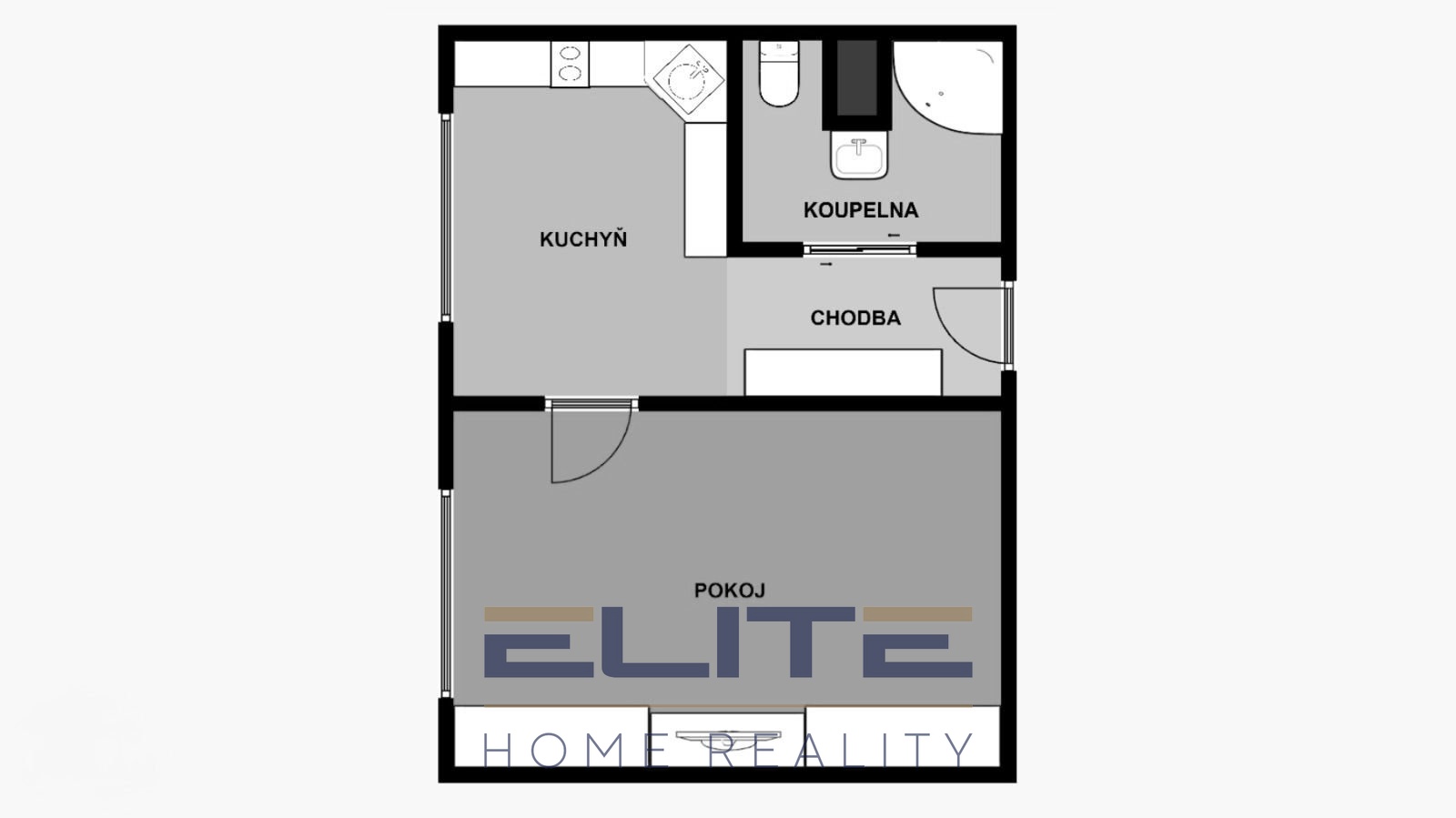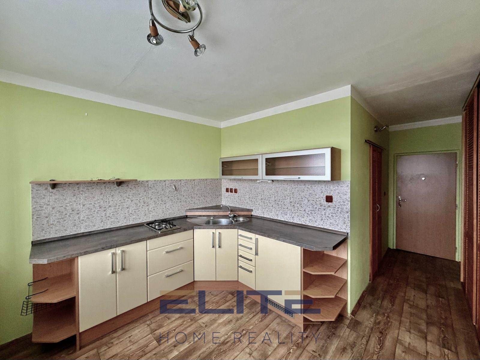 Dispozice bytu nabízí pokoj s kuchyňským koutem, který je vybaven vestavěnými spotřebiči – lednicí s mrazničkou a varnou deskou se dvěma plynovými hořáky.