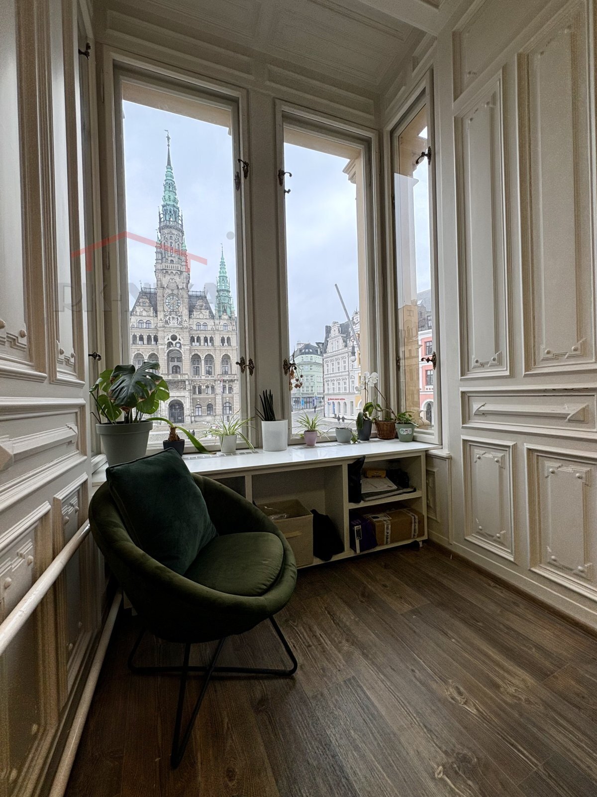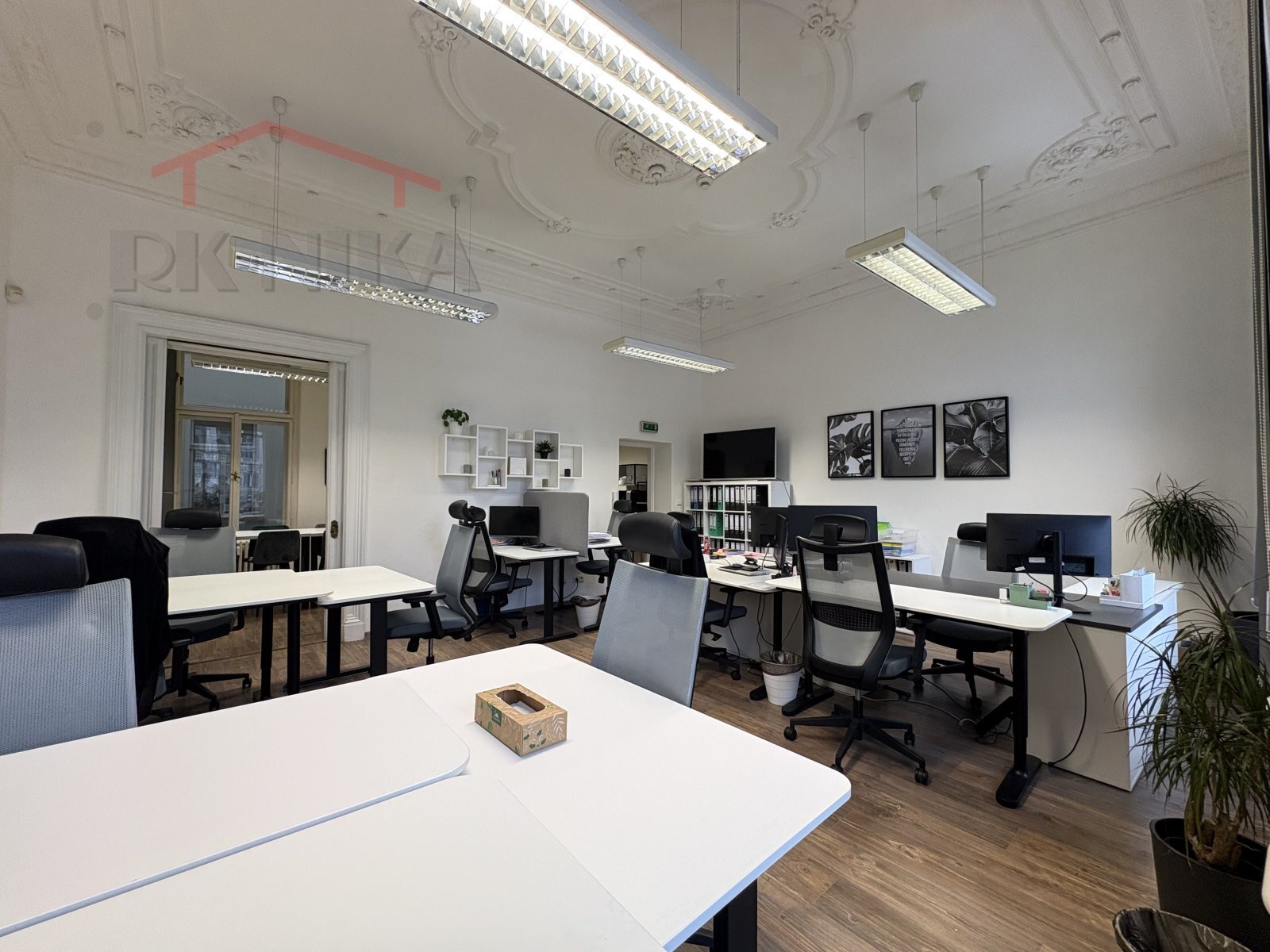 Celková výměra kanceláří činí 147 m² a zahrnuje 8 samostatných místností. Dvě velké kanceláře jsou orientované přímo na náměstí s přímým výhledem na radnici – ideální reprezentativní zázemí pro jednání s klienty.
