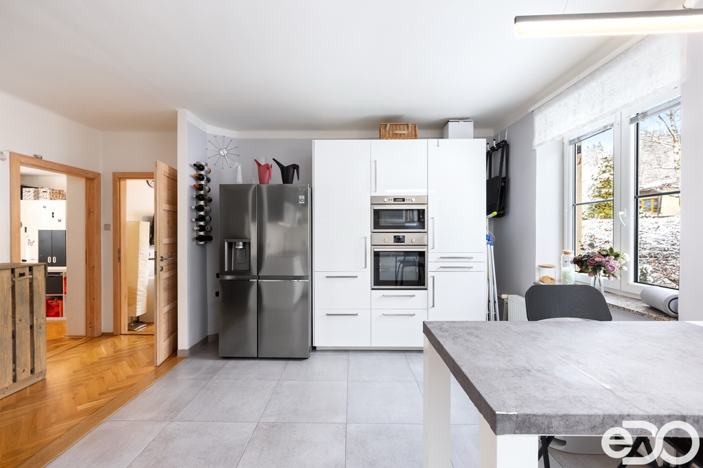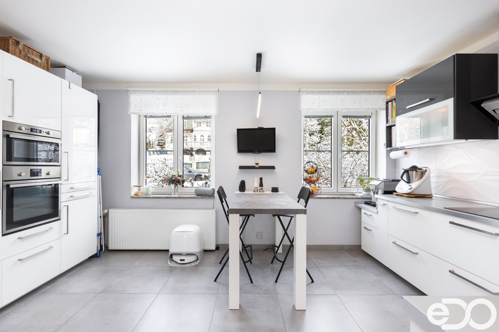 Samotný byt o dispozici 4+1 a podlahové ploše 135 m² se nachází ve druhém nadzemním podlaží čtyřpodlažního zděného domu. Dispozice je klasická, přehledná a funkční. Kuchyň orientovaná na sever poskytuje klidné pracovní zázemí, zatímco obývací pokoj, ložnice i dětský pokoj směřují na jih a jsou po většinu dne zalité sluncem. Velkorysá plocha jednotlivých místností umožňuje pohodlné rodinné bydlení i reprezentativní využití prostoru.