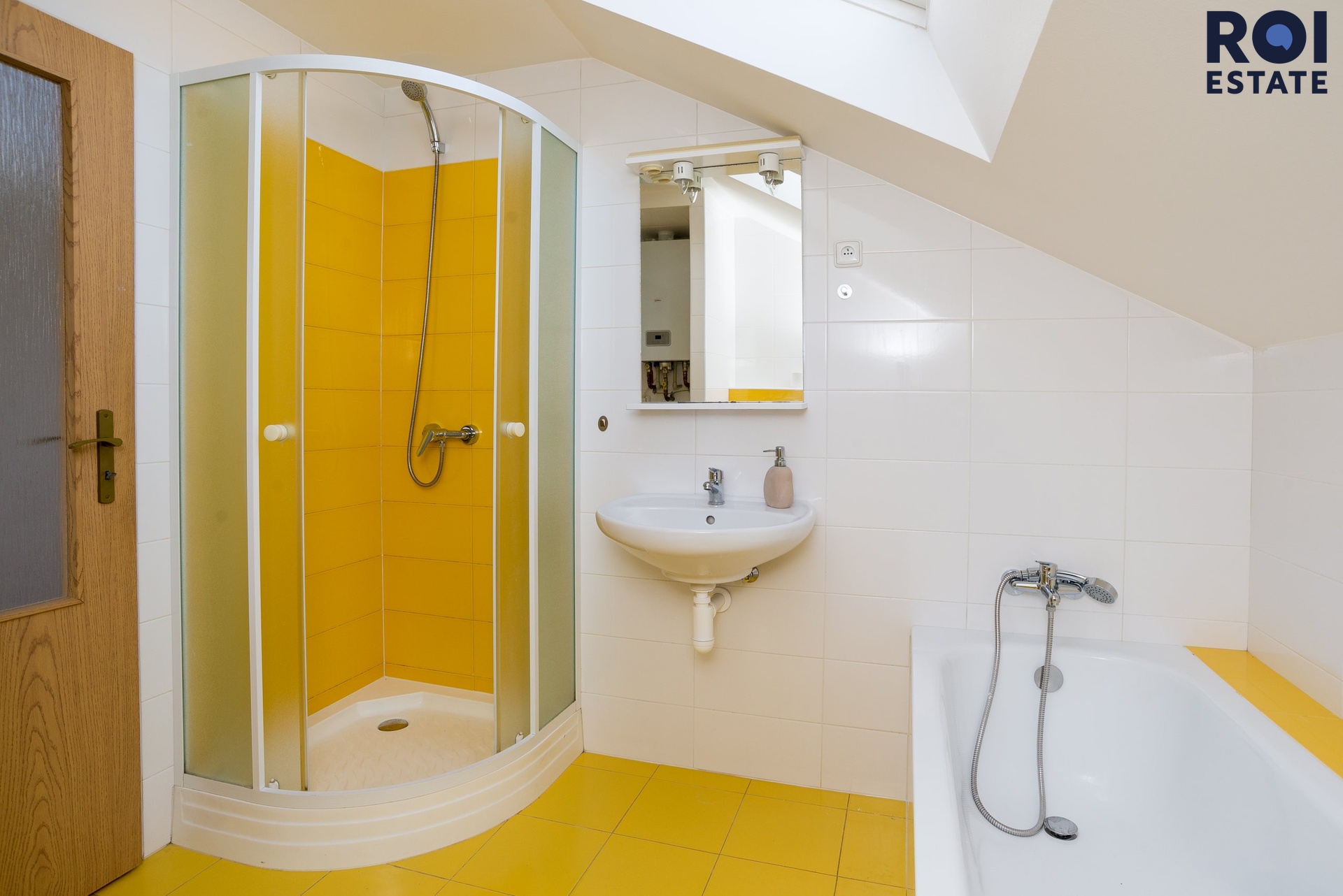 Koupelna nabízí maximální komfort – k dispozici je sprchový kout i vana, toaleta a pračka.