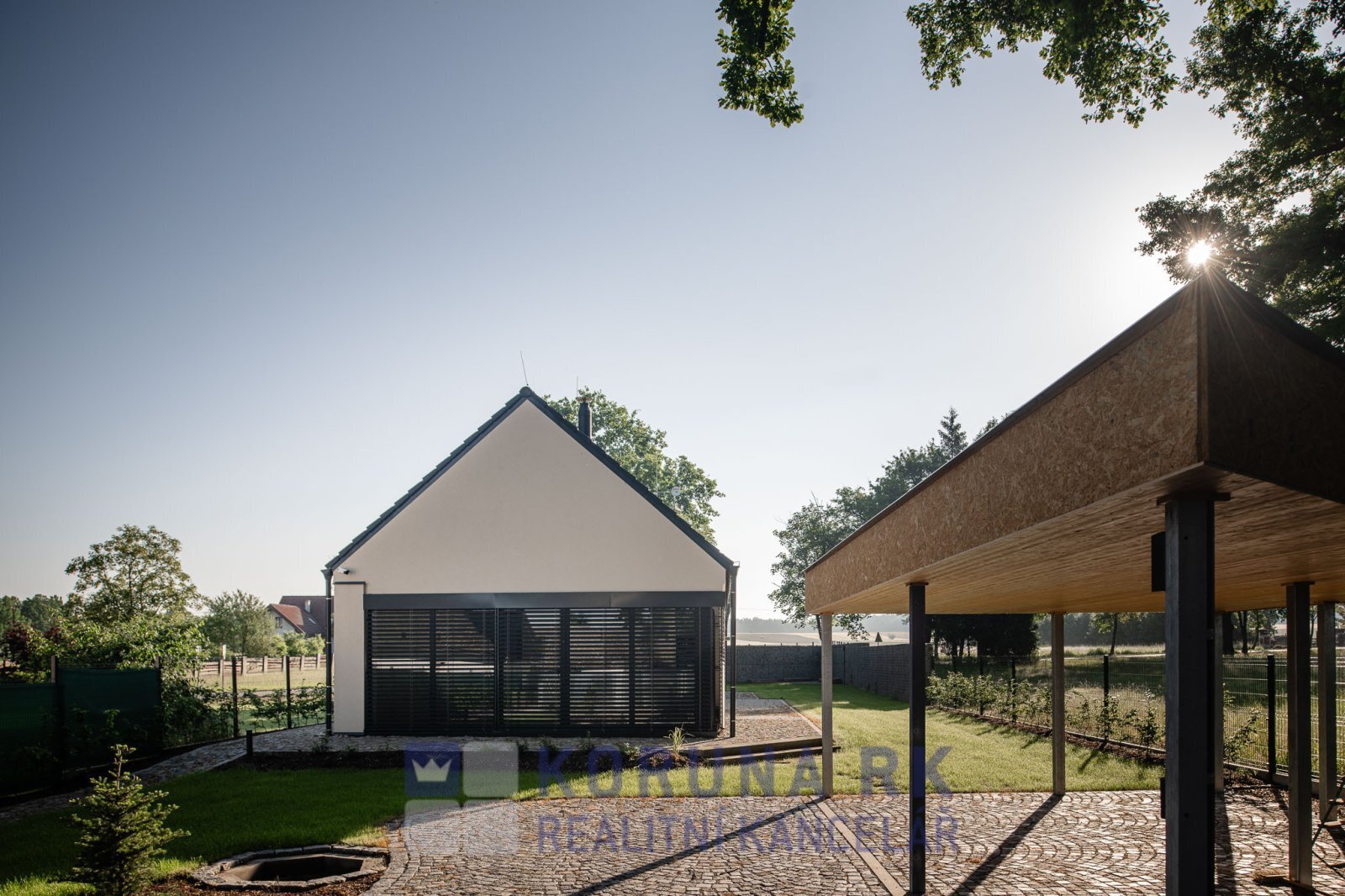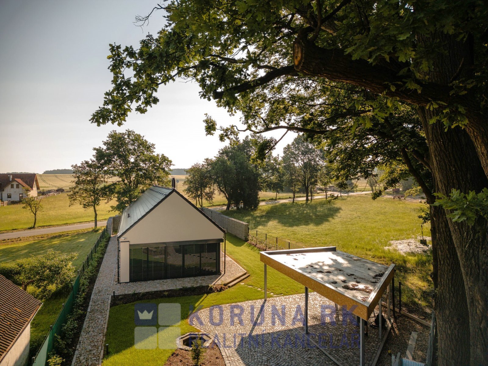 Při stavbě byly použité nadstandardní materiály. Dům má podlahové vytápění s tepelným čerpadlem doplněné krbem v obytném prostoru, klimatizaci, kamerový systém se zabezpečovacím zařízením a elektrické venkovní žaluzie. Z pokojů v přízemí je možný výstup na zpevněnou terasu. Pozemek je celý oplocený (část gabionovým plotem) s vjezdovou automatickou bránou za kterou je zastřešené stání pro dvě auta. Okolo domu je udržovaný trávník, zpevněné plochy jsou s kamenným dlážděným povrchem.