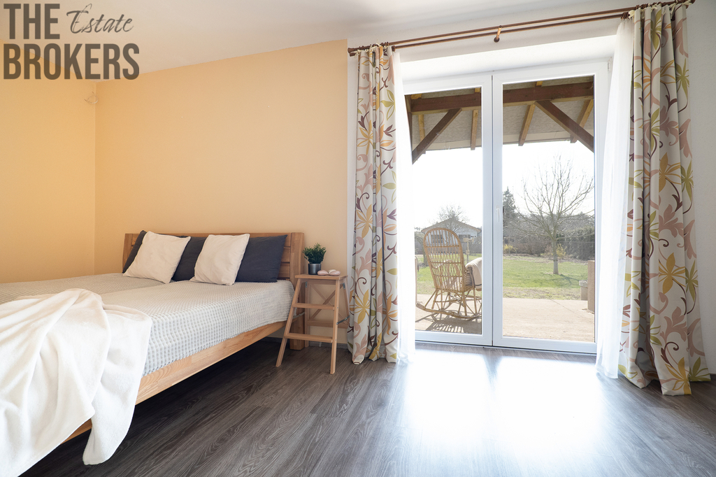 K domu náleží garáž o ploše 26,7 m² a terasa o ploše 27,6 m² orientovaná do zahrady.