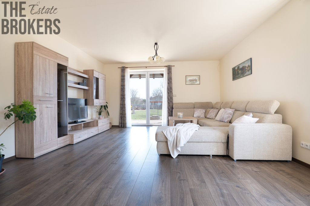 • obývací pokoj propojený s kuchyní, jídelním koutem a spíží