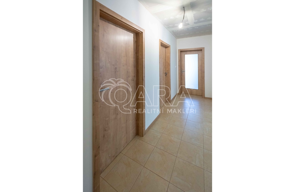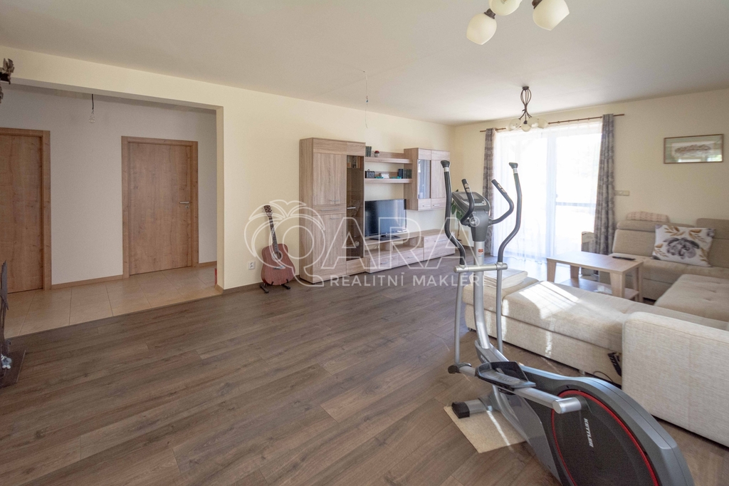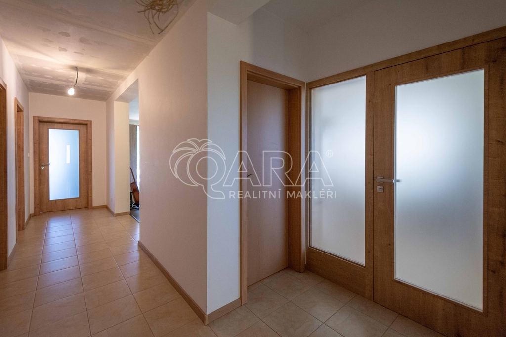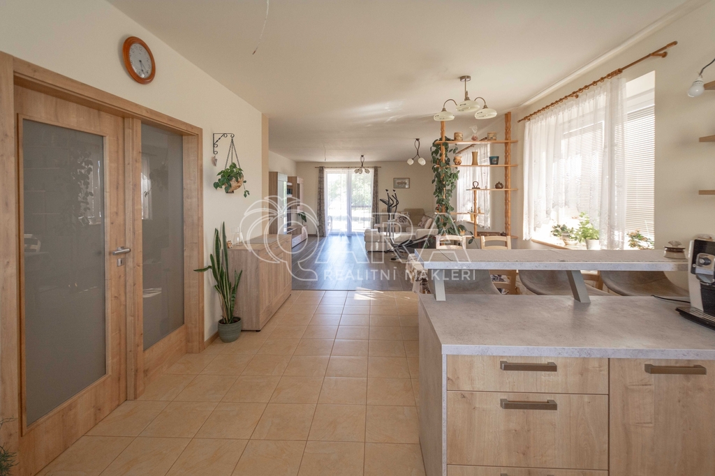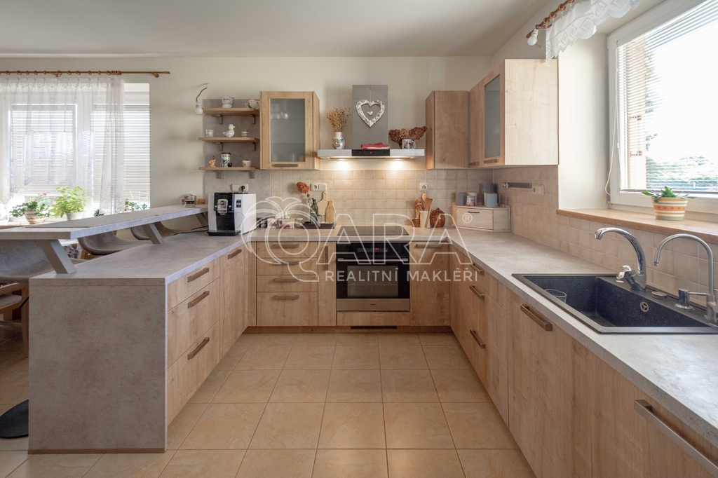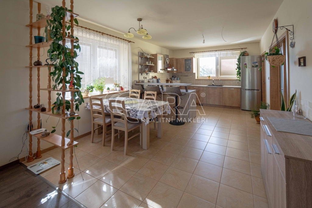 • Na podlaze kombinace dlažby a plovoucí podlahy. Kuchyňská linka včetně vestavných spotřebičů: el. trouba s indukční deskou, digestoř, myčka.
