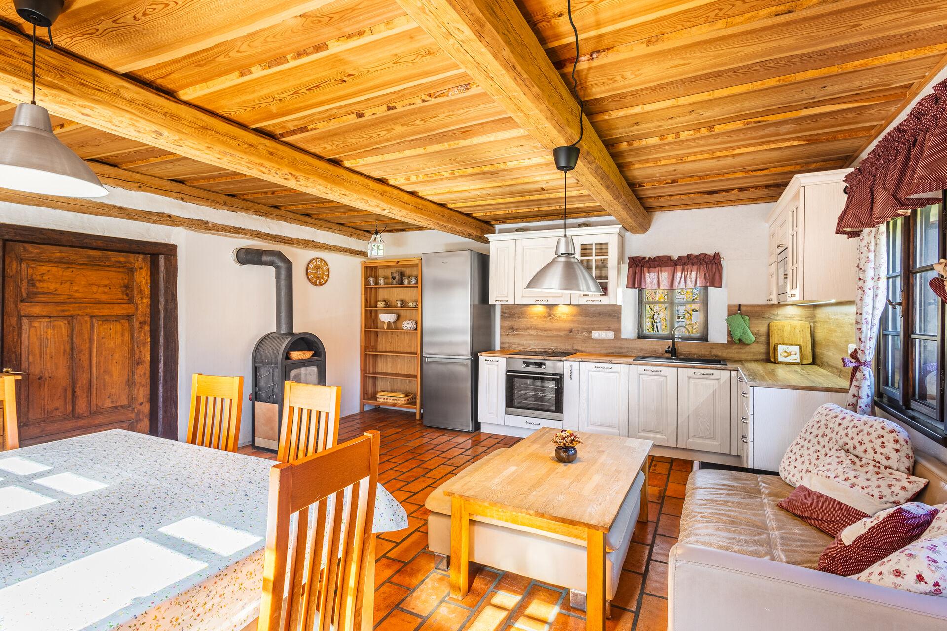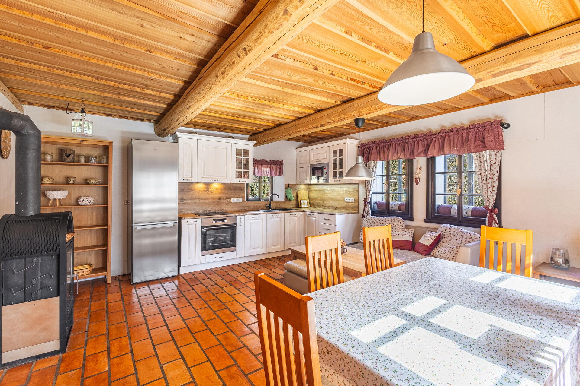 • krásná obytná místnost s okny do zahrady a plně vybavenou kuchyní.