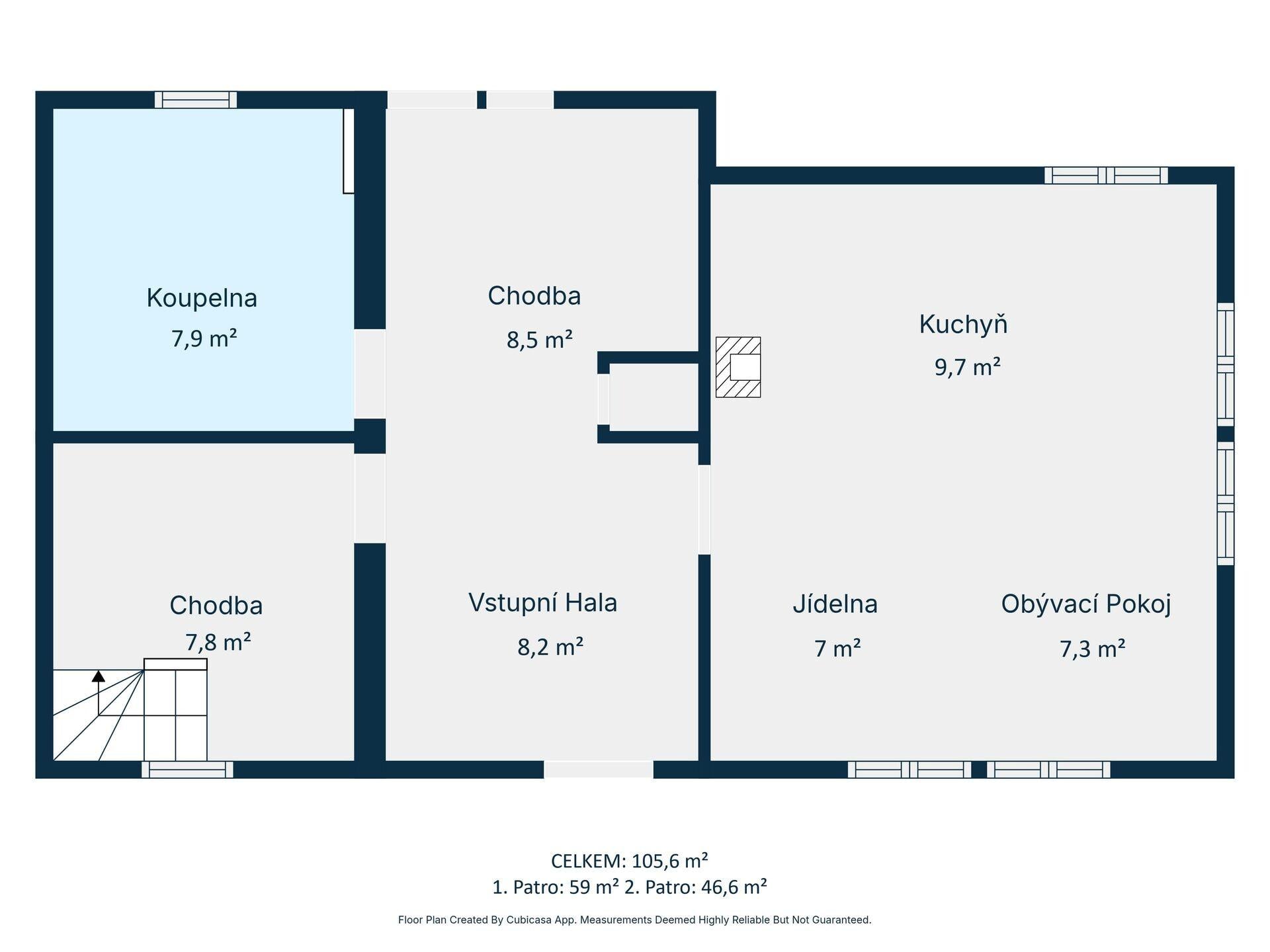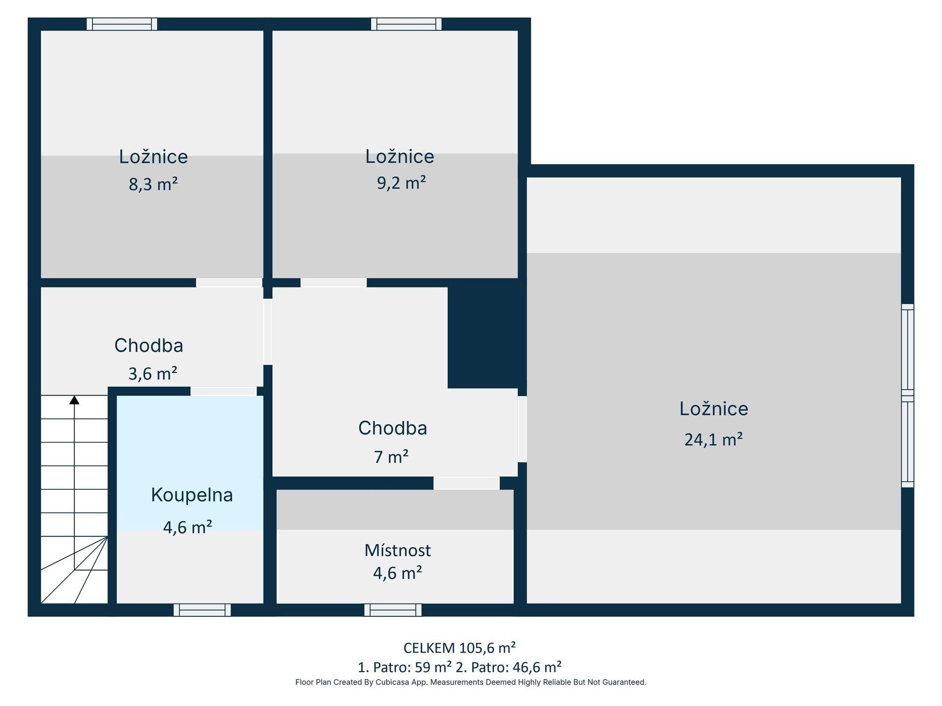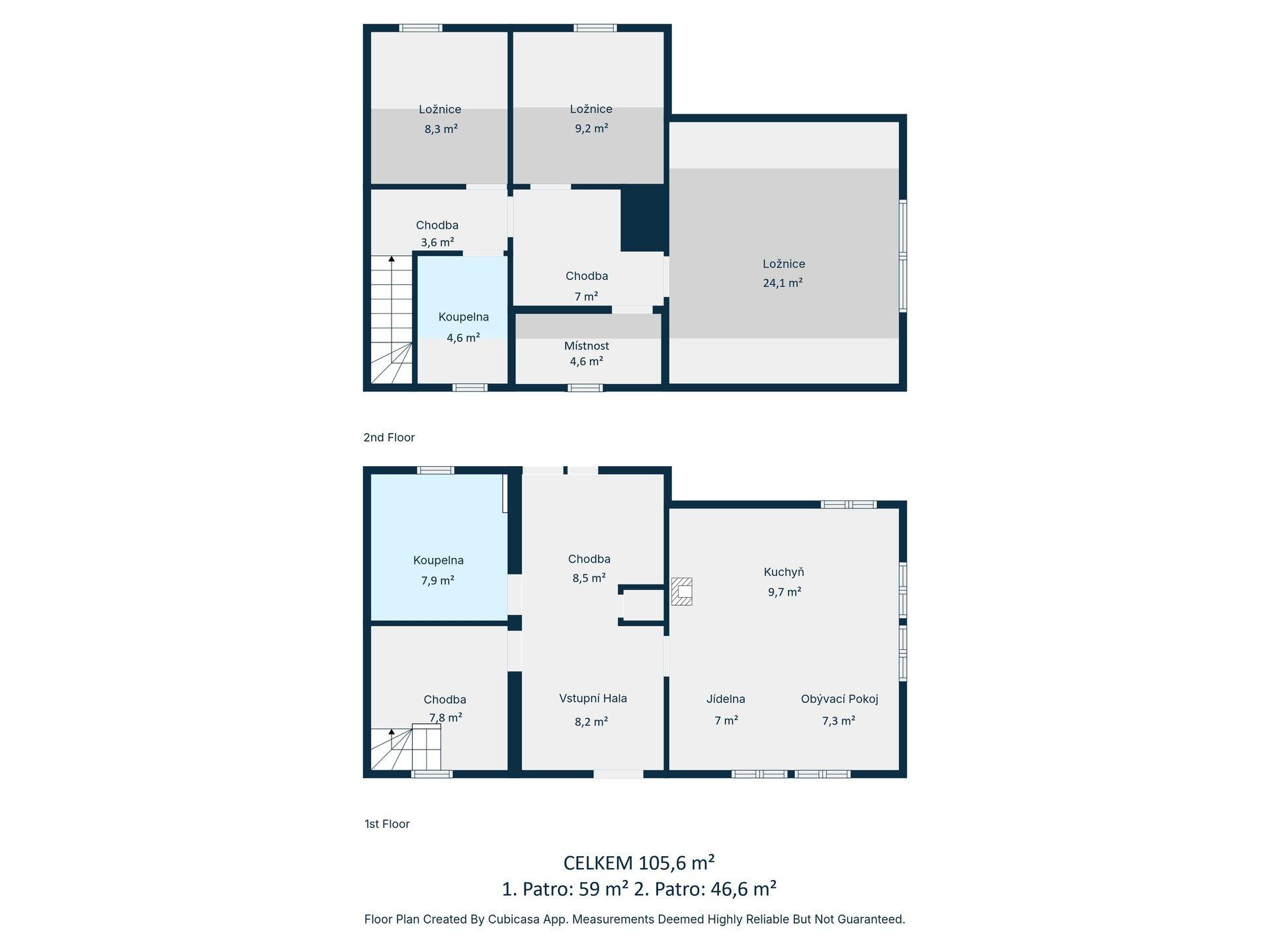 Celková podlahová plocha objektu je 105,6 m², 1NP - 59m² a 2NP - 46,6 m².