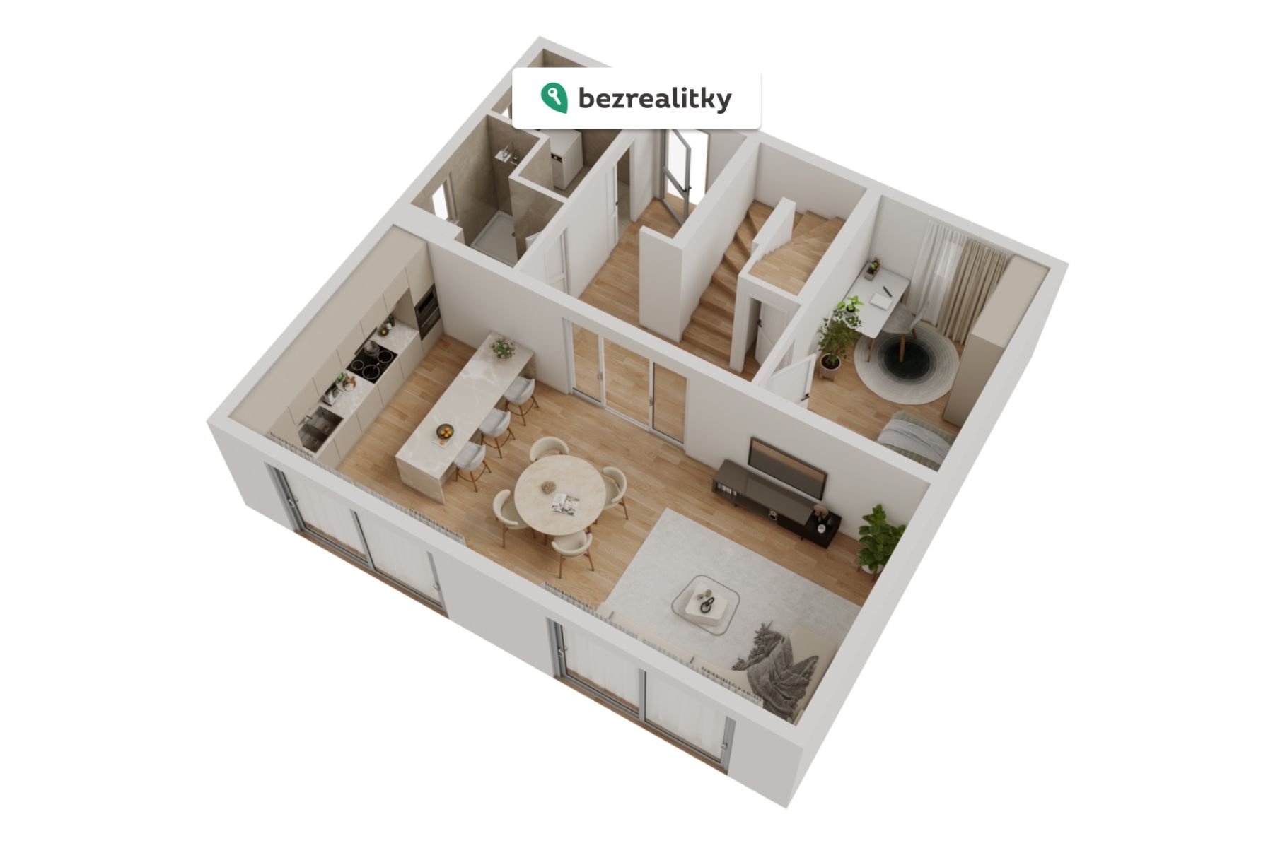Všechny fotografie jsou skutečný stav nemovitosti, pouze pro kuchyňkou linku a závěsy byla použita vizualizace. Zahrada je ve fázi terénních úprav, které budou dokončeny jakmile to klimatické podmínky dovolí.