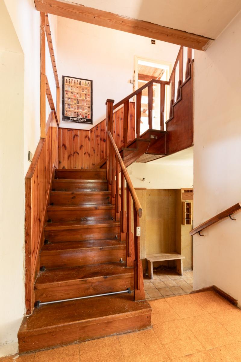 Do prvního patra vede krásné dřevěné schodiště. Najdeme zde jeden velký pokoj s postelí v patře pro účelné využítí prostoru. Na druhé straně se nachází rozlehlá půda, kde může vzniknout velký obytný prostor, který může být třeba rozdělen i na více pokojů.