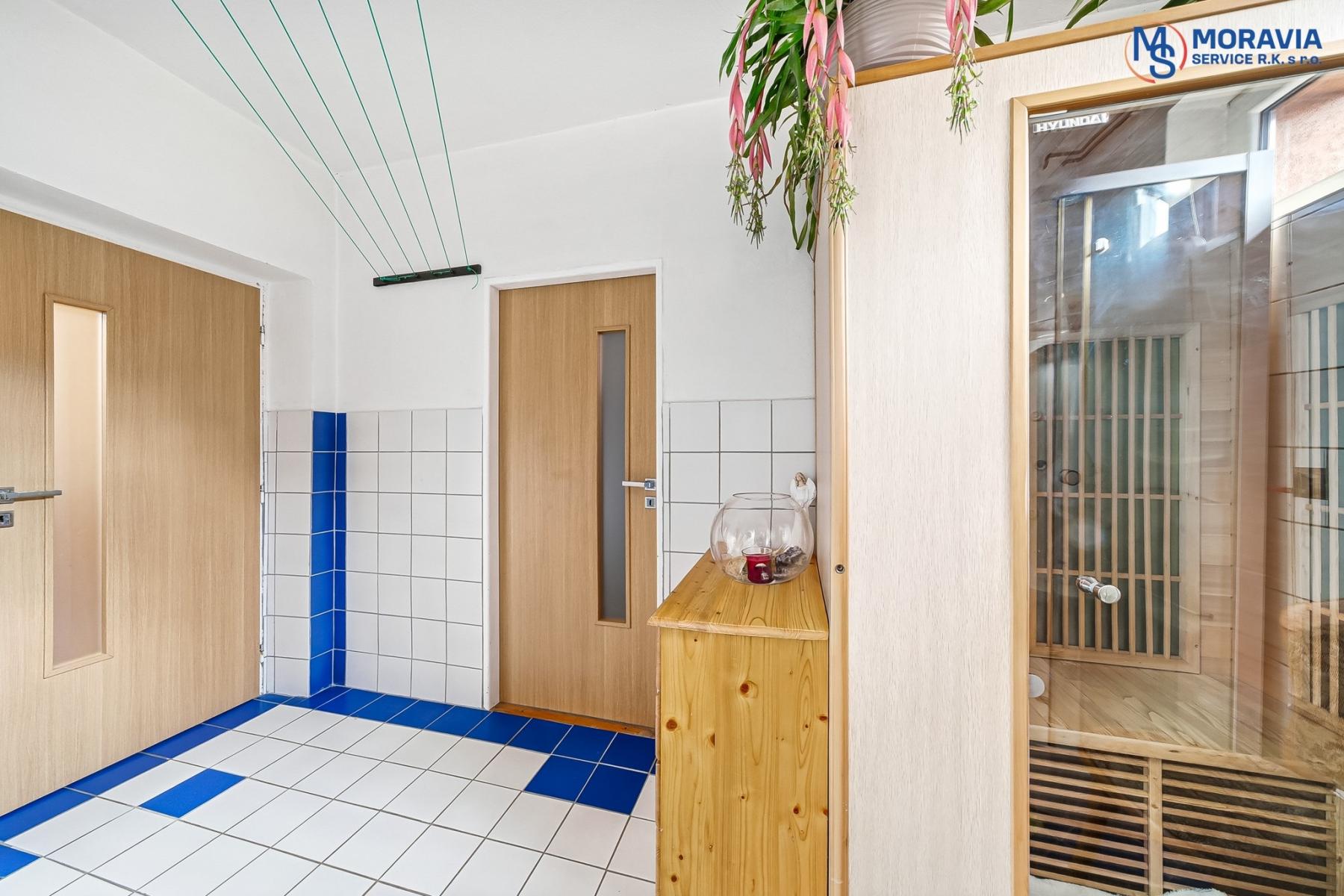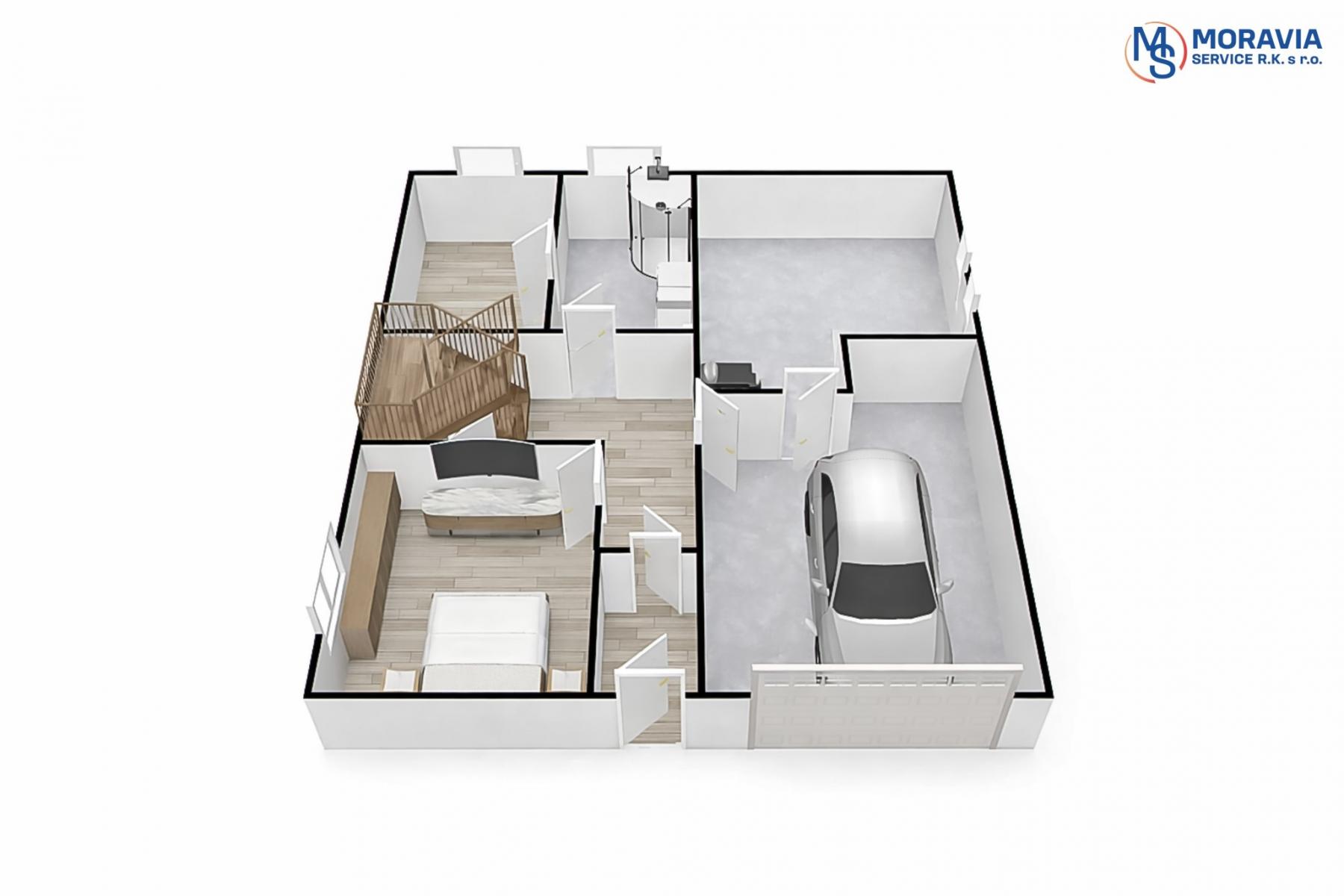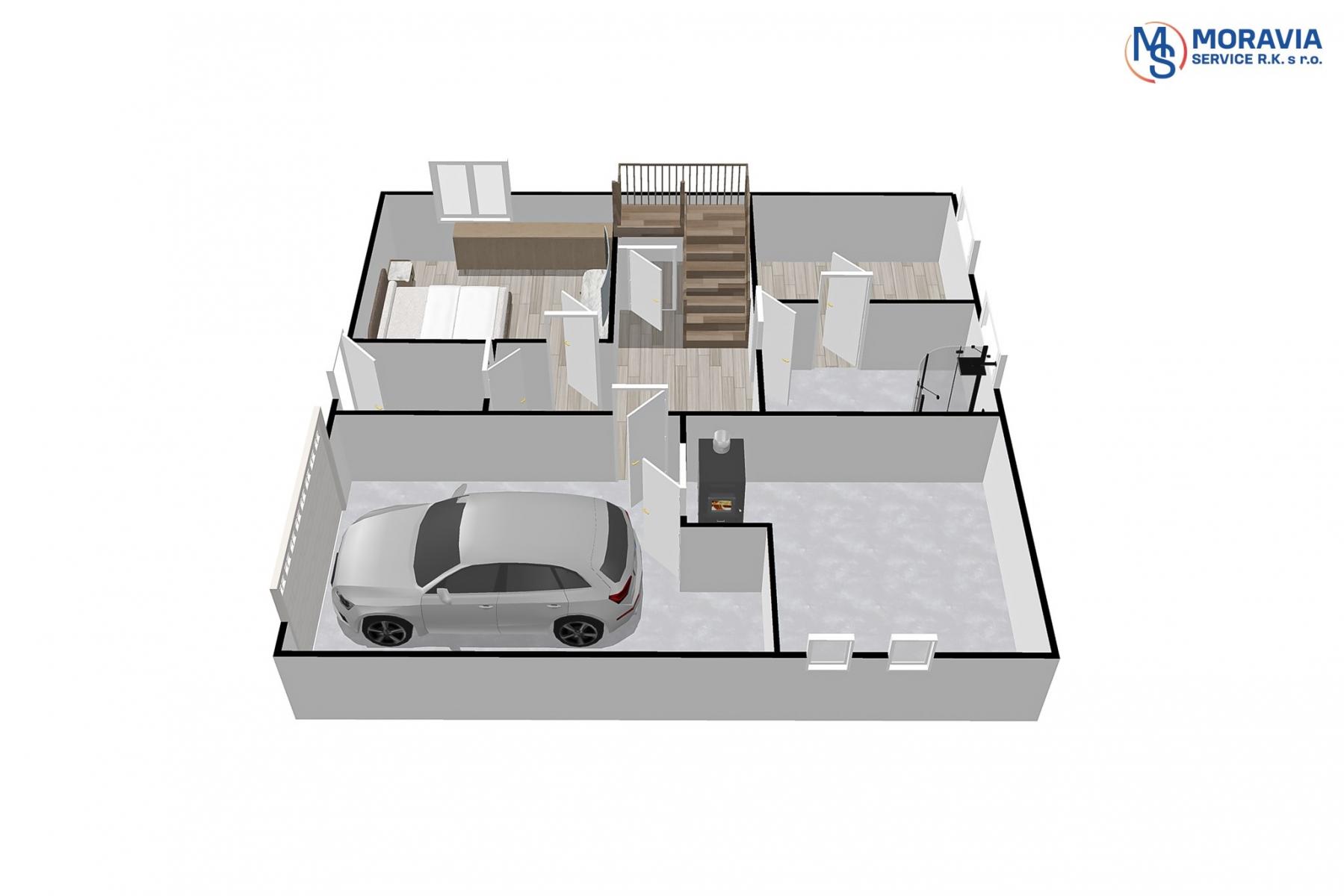 Přízemí: samostatný pokoj, garáž, technická místnost, sauna, koupelna, wc, sklep, samostatně stojící dvoj garáž