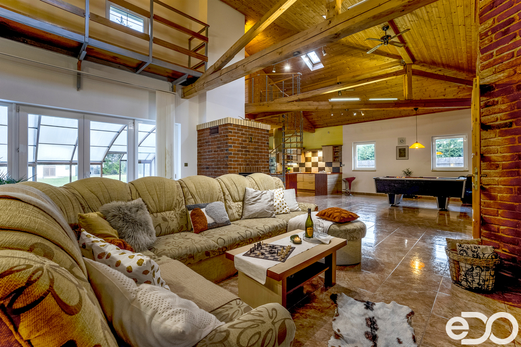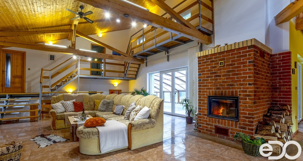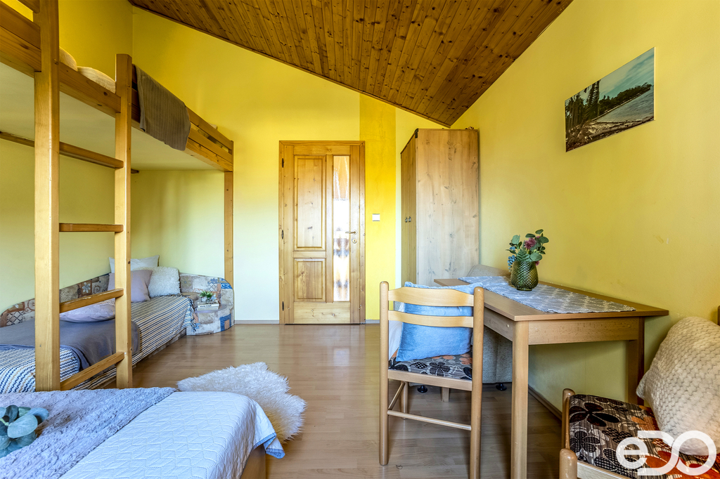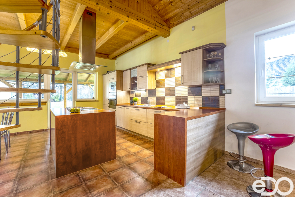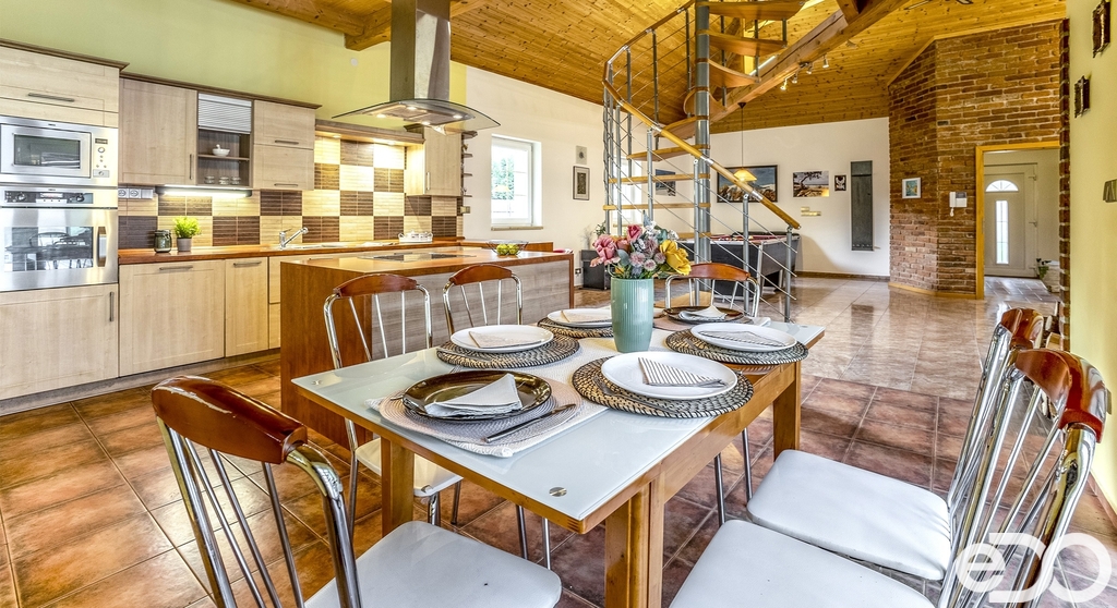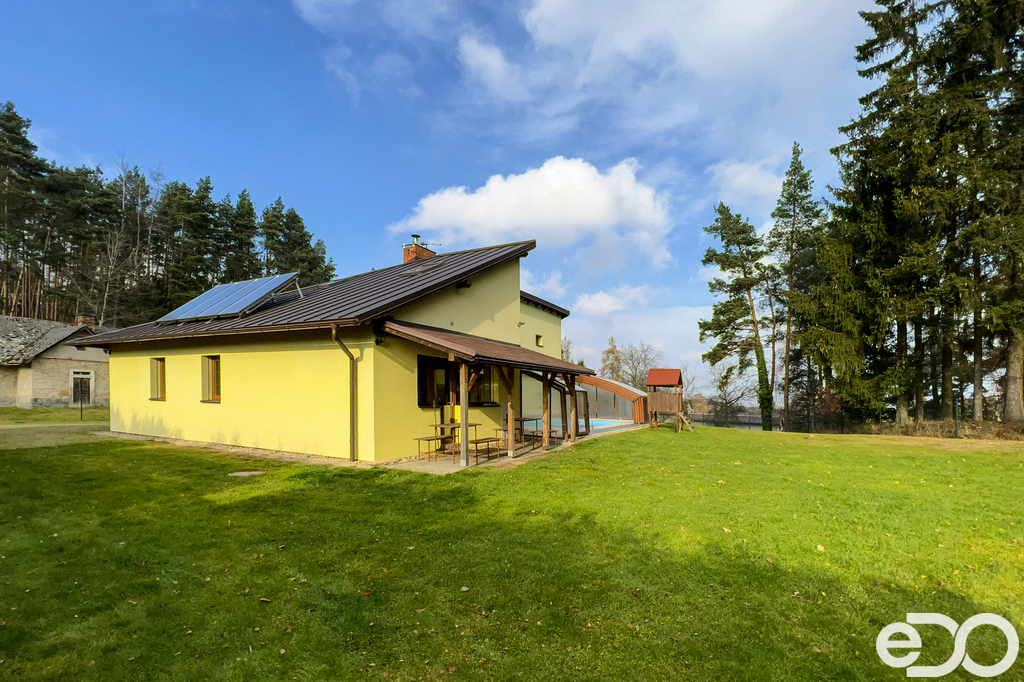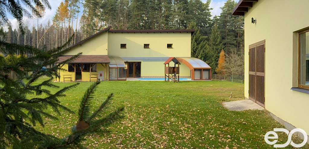 Tato vila vytváří dojem horského chaletu díky modernímu zpracování vnitřního prostoru z přírodního materiálu s kombinací kovu a dřeva. Z příjezdové cesty dojedete rovnou na parkoviště u domu, kde také naleznete hlavní vchod. Dům disponuje s prostornou a velkou halou, ze které se dostanete po schodišti do všech pokojů. V přízemí se nachází sauna, vířivka a vyhřívaný bazén se slanou vodou. Moderní vybavenou kuchyň s jídelnou doplňuje útulný prostor s kulečníkovým stolem a krbem. Dalším vstupem, jenž tento dům nabízí je z kuchyně na terasu a zahradu, která je roky velmi dobře udržována a oplocena. Na zahradě se nachází menší domek, dřevěný altán ze kterého se dostanete pěší (5min) do kamenolomu kde můžete strávit den koupáním. Dominantou tohoto chytrého domu jsou nejen velmi nízké provozní náklady (vlastní vrtaná studna, kombinace vytápění, které si můžete zvolit: krb, solár, FVE či elektrické vytápění v podlaze), ale roční výnos z pronájmu, který činní do 1.000.000,- kč. Lokalita je velmi vhodná jak pro klidný rodinný život v soukromí nebo jako investice k pronajímání!