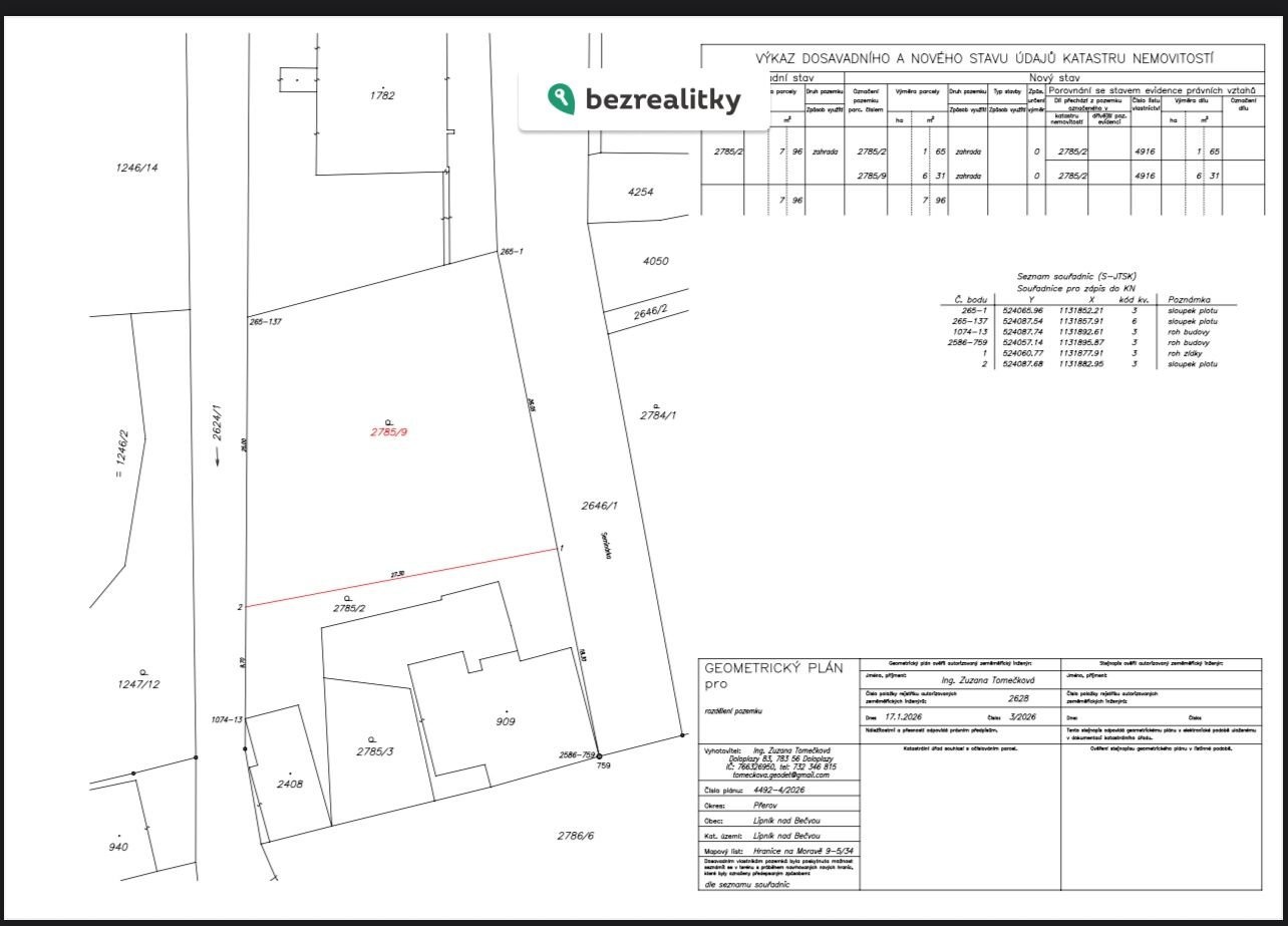 Jako výlučná majitelka nabízím k prodeji stavební pozemek o výměře 631 m² v klidné a již zastavěné části města Lipník nad Bečvou – ulice Na Bečvě ( nově vymezena parcela 2785/9)
