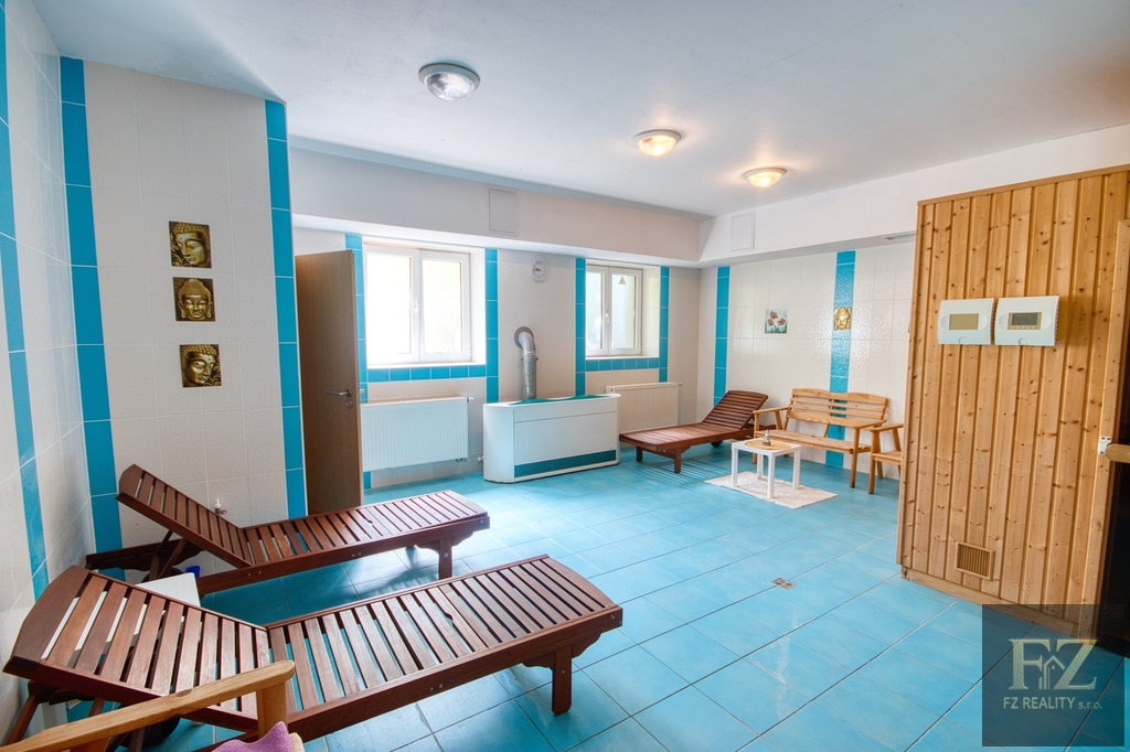 V Rezidenci je k dispozici v suterénu sauna pro 6 osob, dále prádelna, šatny a sprchy (2 oddělené místnosti se skříňkami, sprchou s toaletou).