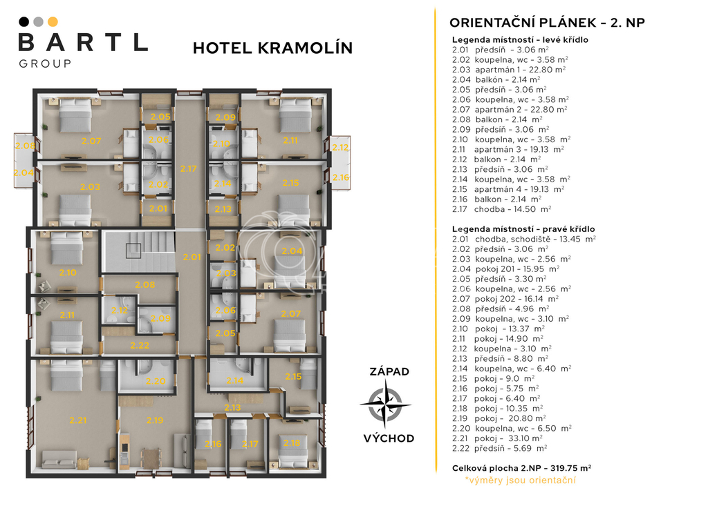Samotná budova disponuje více než 1 200 m² užitné plochy a je rozdělena do tří podlaží. K dispozici je celkem 17 pokojů, včetně prostorných rodinných apartmánů, s celkovou kapacitou 74 lůžek. Nad rámec této kapacity jsou součástí hotelu také prostory pro personál a místnosti využívané majitelem pro vlastní potřebu. Zázemí doplňuje restaurace pro 80 hostů a samostatný salonek pro 50 osob. Hotel je tak připraven nabídnout komfort nejen rodinám, ale také školám, sportovním skupinám nebo firemní klientele.