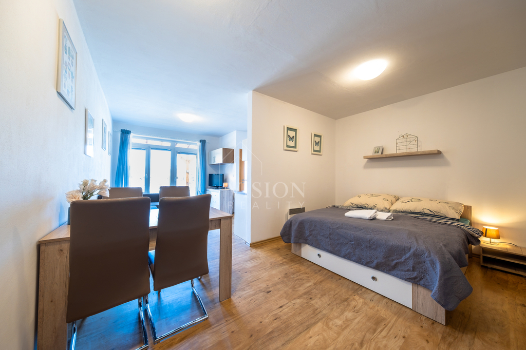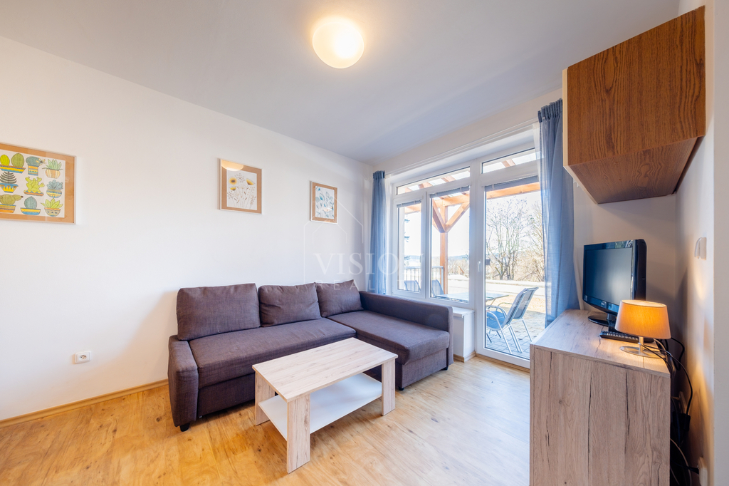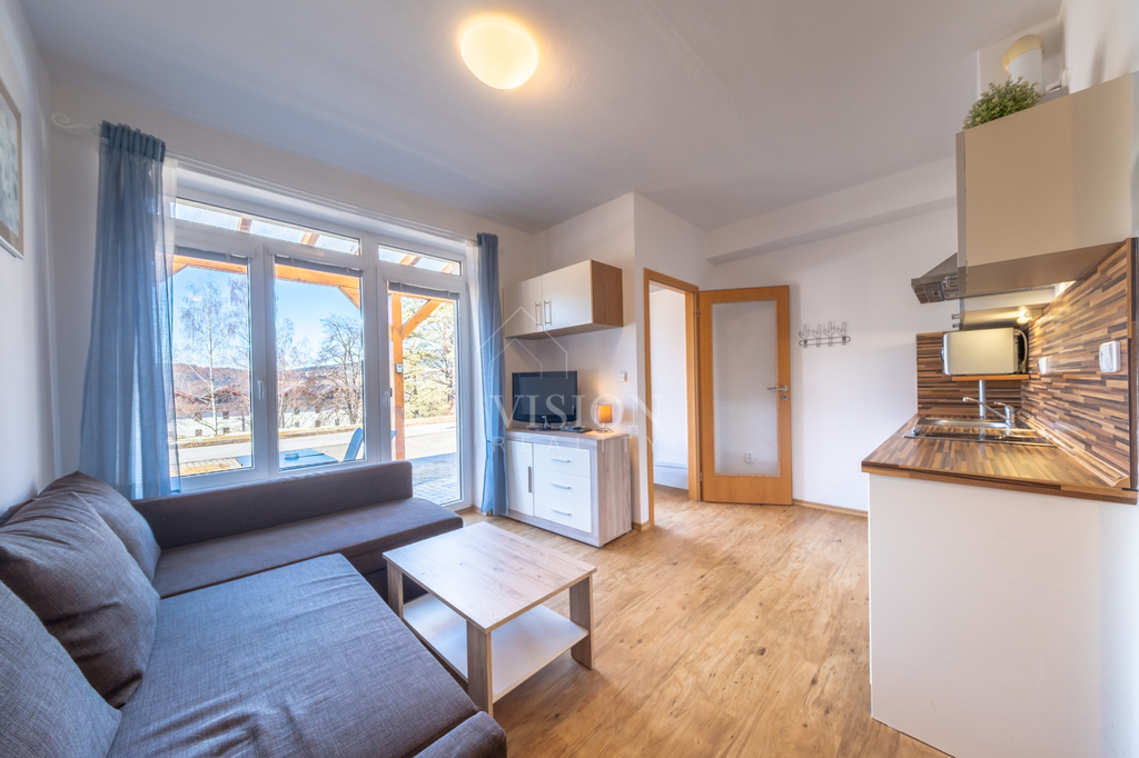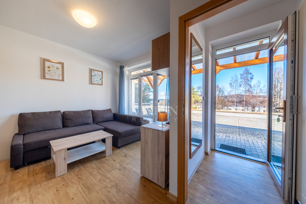 Nabízíme k prodeji elegantní, plně zařízený a nadčasově řešený apartmán v osobním vlastnictví o dispozici 1+kk o podlahové ploše 41 m², situovaný v klidné části vyhledávané lokality Lipno nad Vltavou.