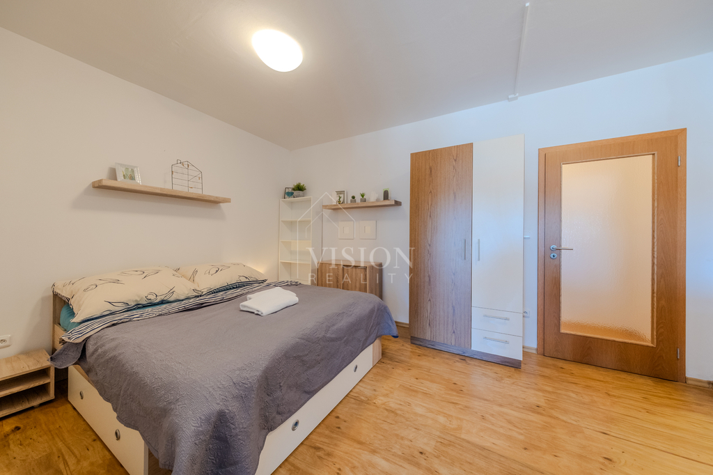 Dispozice jednotky zahrnuje zádveří, kuchyni propojenou s obývací částí, samostatnou ložnici, koupelnu se sprchovým koutem a samostatné WC. Kuchyň je vybavena spotřebiči včetně lednice, myčky nádobí a mikrovlnné trouby, varná deska .Samozřejmostí je TV s plochou obrazovkou a Wi-Fi připojení. Terasa před jednotkou poskytuje příjemný prostor pro relaxaci a nerušený odpočinek. Parkování před apartmánem.