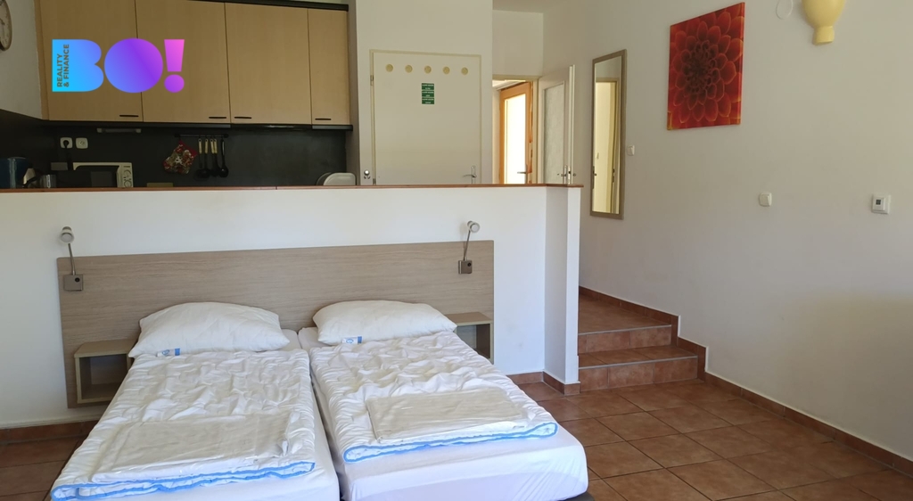 Apartmán o výměře 49,88 m² je kompletně zařízen novým nábytkem a nachází se v přízemí budovy.
