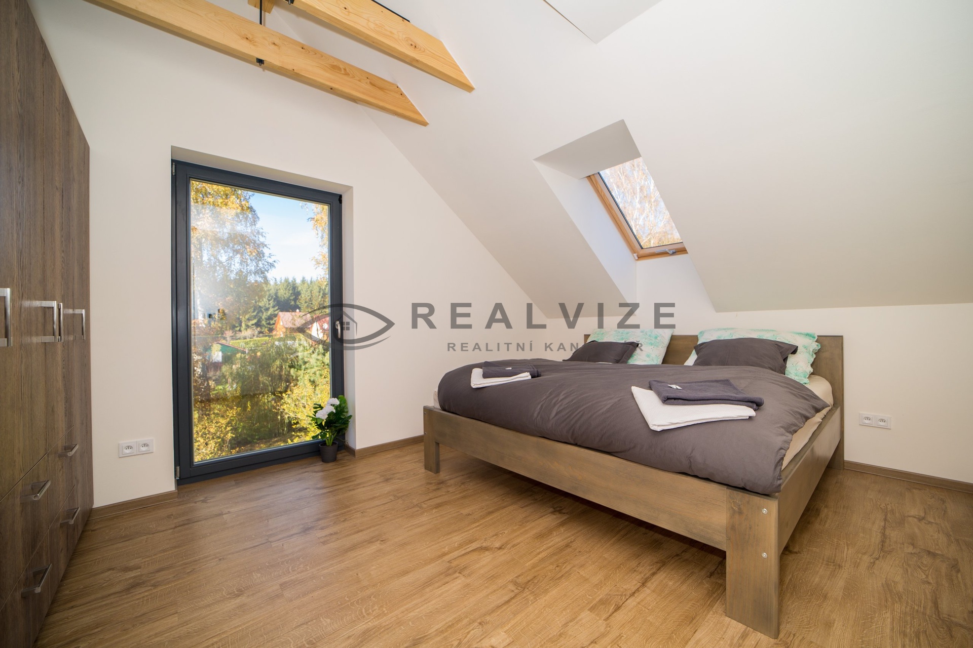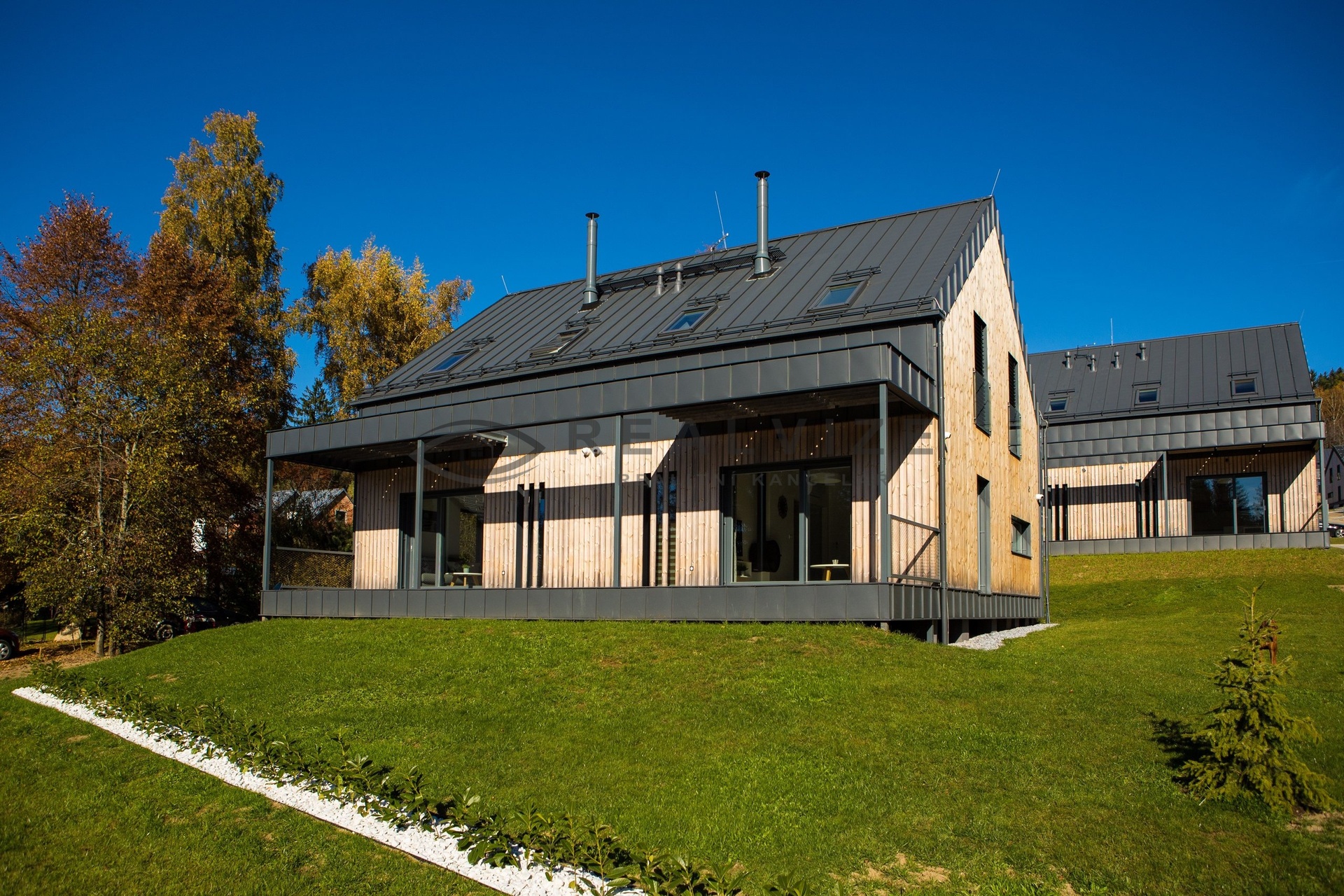 Technologie: Vytápění elektrickým podlahovým topením s možností dálkového řízení, fotovoltaika s akumulací, klimatizace, nabíječka na elektroauto, elektronický zabezpečovací systém, venkovní žaluzie.